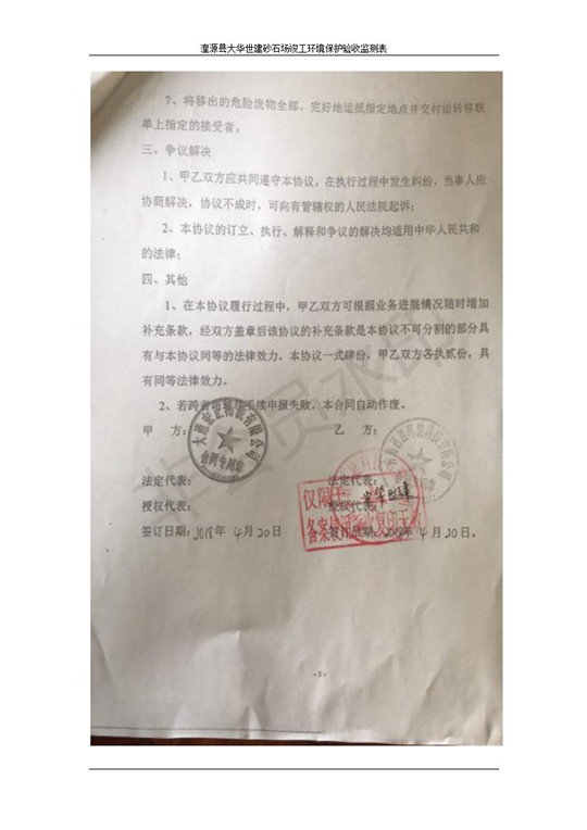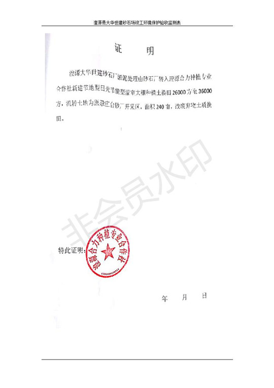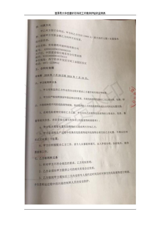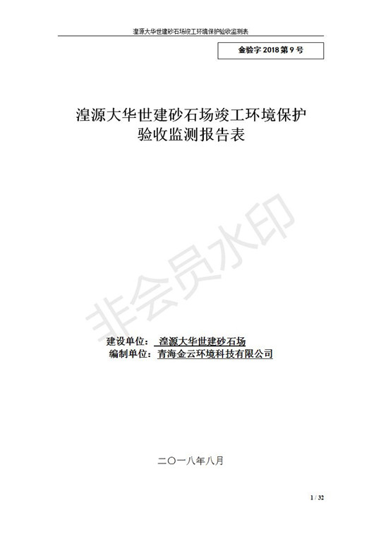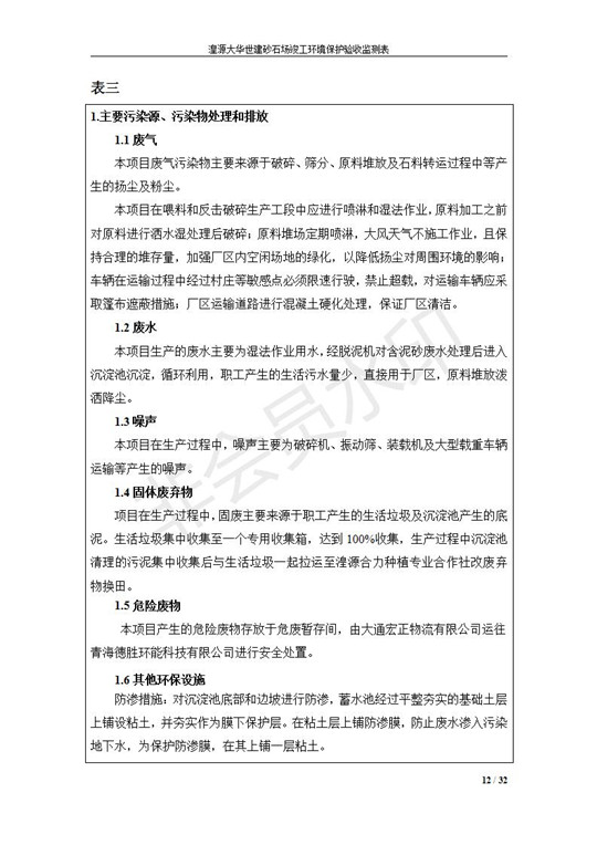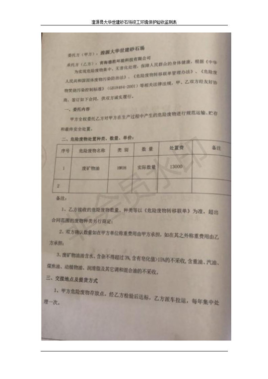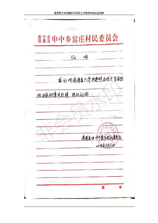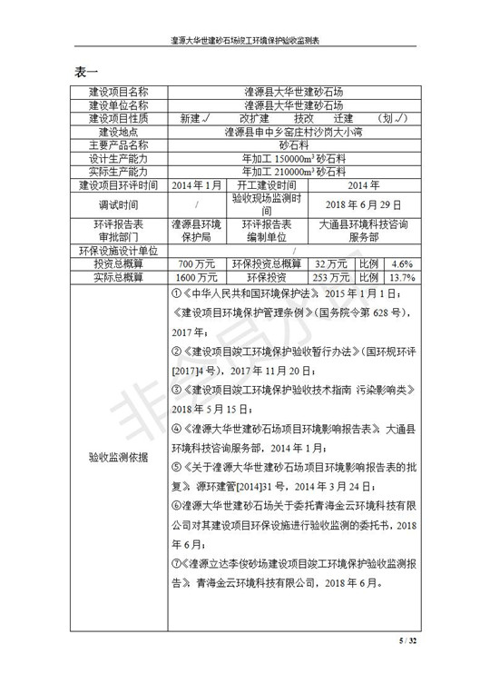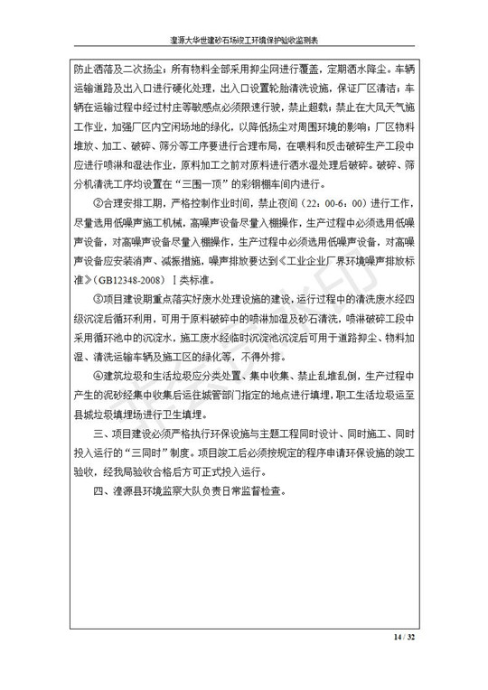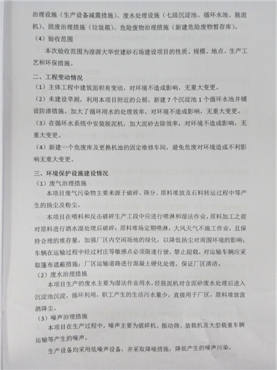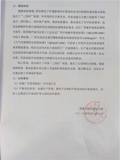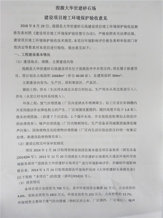 根據(jù)中華人民共和國國務(wù)院令第253號《建設(shè)項(xiàng)目環(huán)境保護(hù)管理?xiàng)l例》(中華人民共和國國務(wù)院令第682號《國務(wù)院關(guān)于修改〈建設(shè)項(xiàng)目環(huán)境保護(hù)管理?xiàng)l例〉的決定》和《建設(shè)項(xiàng)目竣工環(huán)境保護(hù)驗(yàn)收暫行辦法》,嚴(yán)格依照有關(guān)法律法規(guī),建設(shè)項(xiàng)目環(huán)境保護(hù)設(shè)施驗(yàn)收技術(shù)規(guī)范,本項(xiàng)目環(huán)評報(bào)告表和環(huán)保審批部門審批意見以及企業(yè)自行驗(yàn)收相關(guān)要求等對本項(xiàng)目進(jìn)行驗(yàn)收,本項(xiàng)目符合環(huán)保驗(yàn)收條件,可以通過環(huán)保驗(yàn)收。 湟源大華世建砂石場建設(shè)項(xiàng)目竣工環(huán)境保護(hù)驗(yàn)收意見.
