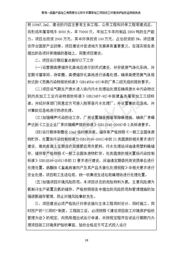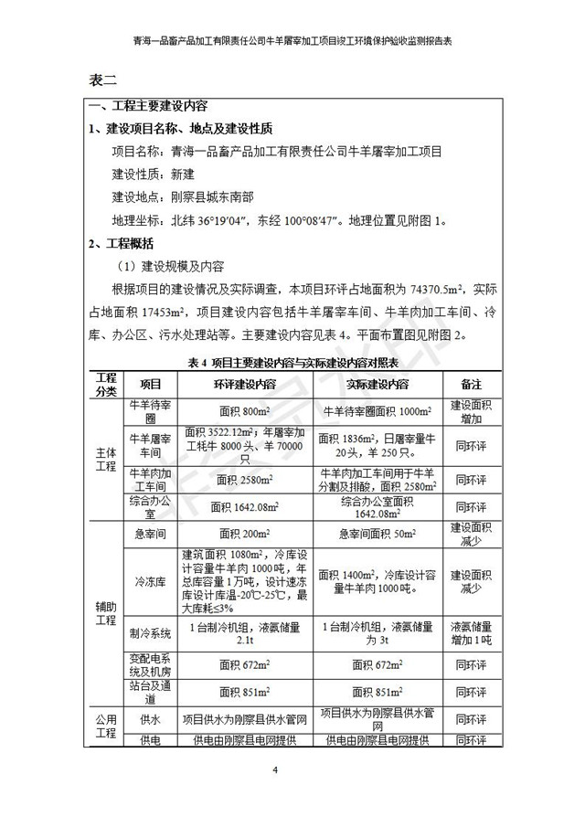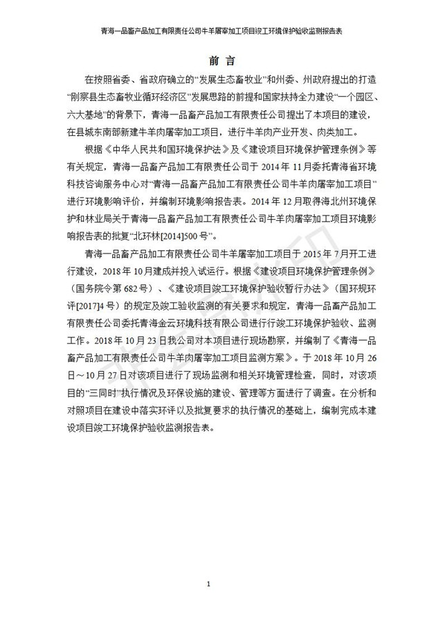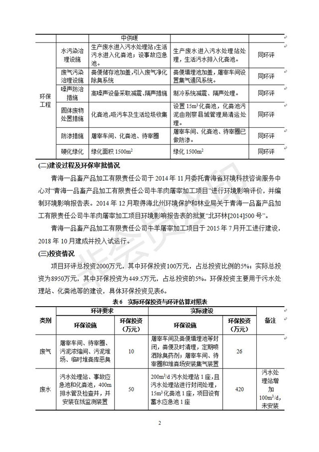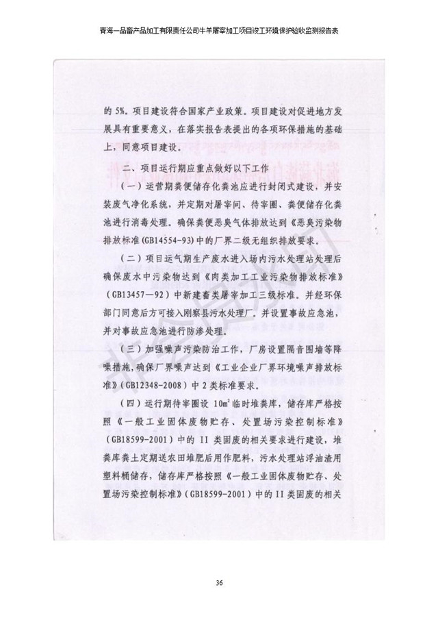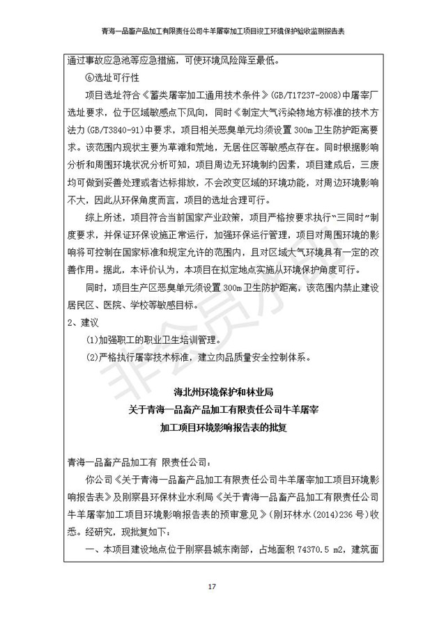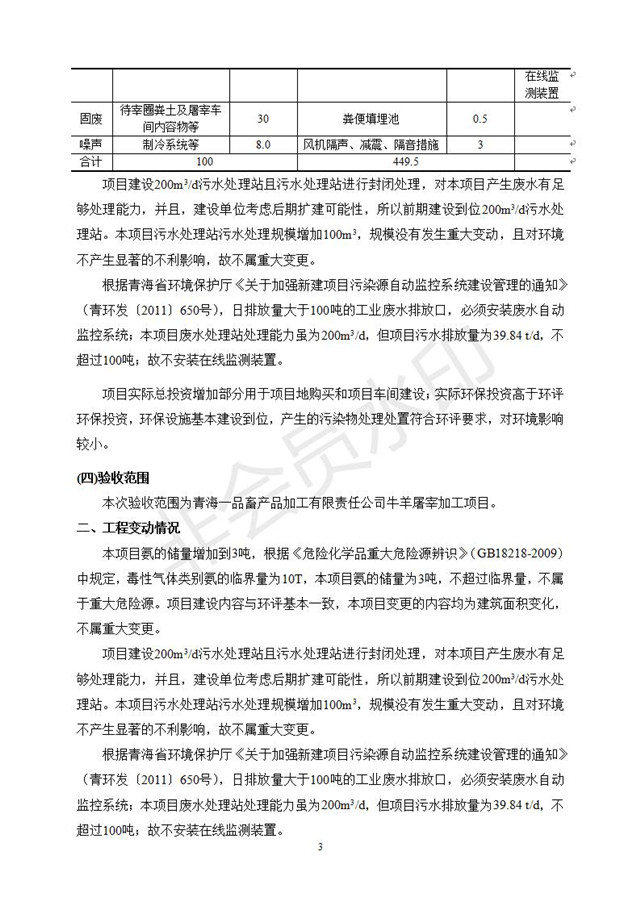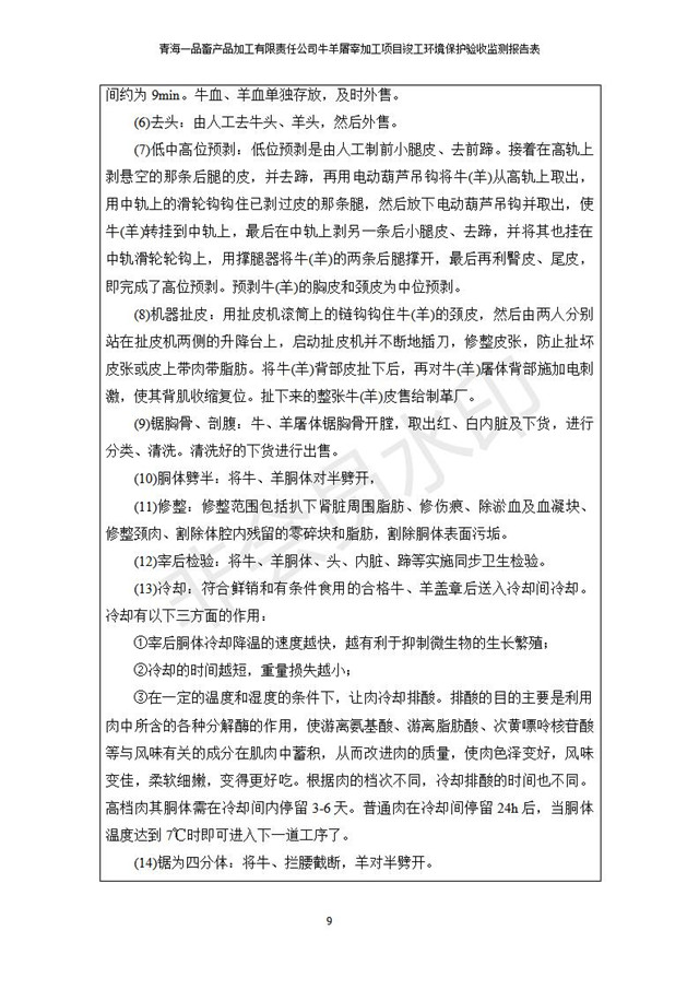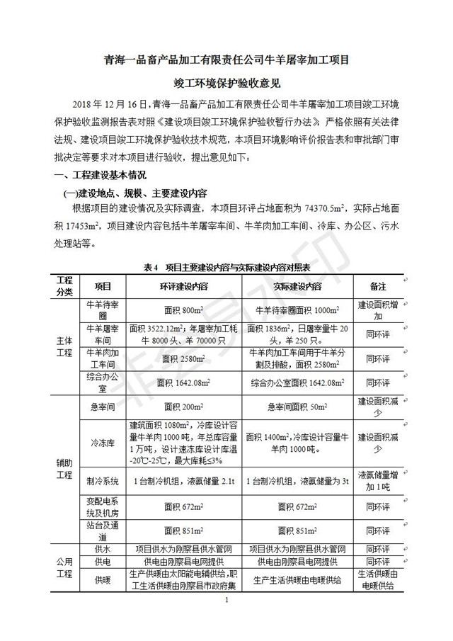 根據(jù)中華人民共和國國務(wù)院令第682號《國務(wù)院關(guān)于修改〈建設(shè)項目環(huán)境保護(hù)管理條例〉的決定》和《建設(shè)項目竣工環(huán)境保護(hù)驗收暫行辦法》(國務(wù)院令682號),青海一品畜產(chǎn)品加工有限責(zé)任公司牛羊屠宰加工項目(包括竣工環(huán)境保護(hù)驗收監(jiān)測報告表和驗收意見)公示如下。 一、項目名稱:青海一品畜產(chǎn)品加工有限責(zé)任公司牛羊屠宰加工項目竣工環(huán)境保護(hù)驗收監(jiān)測報告表 二、地點(diǎn):剛察縣縣城東大街加油站東側(cè) 三、建設(shè)單位:青海一品畜產(chǎn)品加工有限責(zé)任公司 四、建設(shè)內(nèi)容:項目地面積17453m2,項目建設(shè)內(nèi)容包括牛羊屠宰車間、牛羊肉加工車間、冷庫、辦公區(qū)、污水處理站等。 五、聯(lián)系人:張工 七、公示時間:二〇一九年一月十一日至二〇一九年二月七日 公示期間,對上述公示內(nèi)容如有異議,請以書面形式反饋,個人須署真實姓名,單位須加蓋公章。