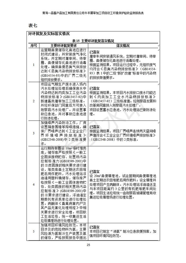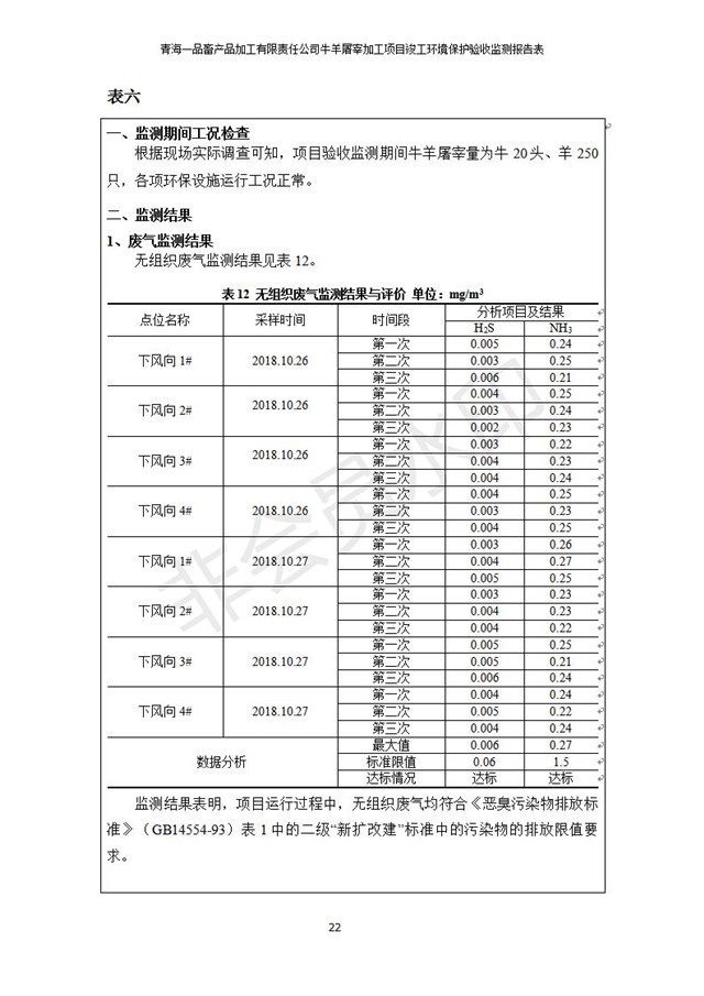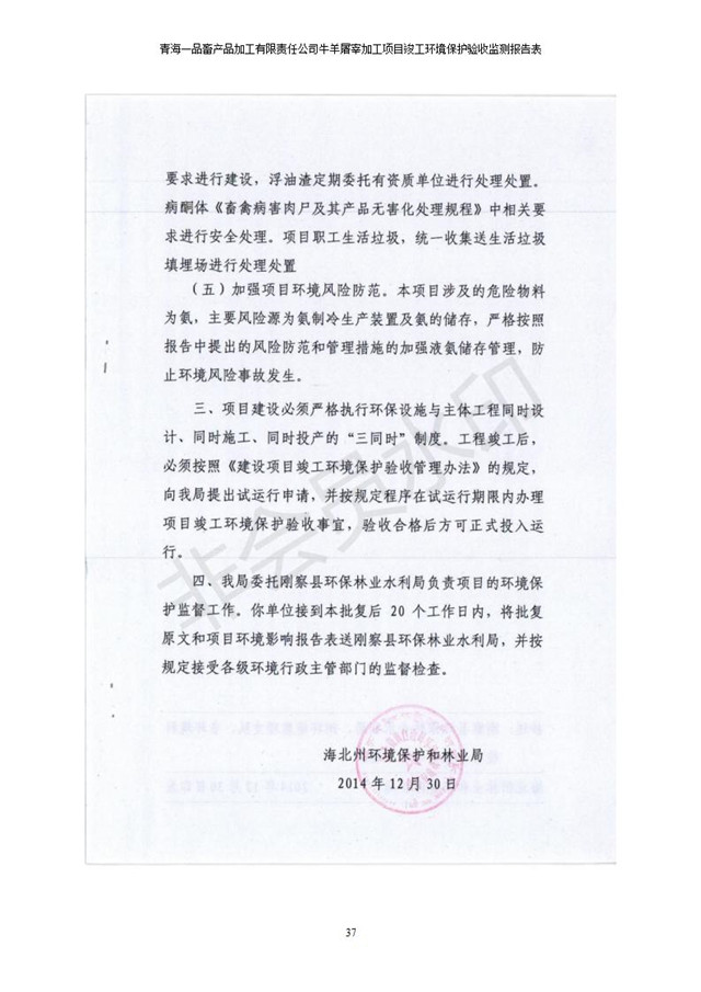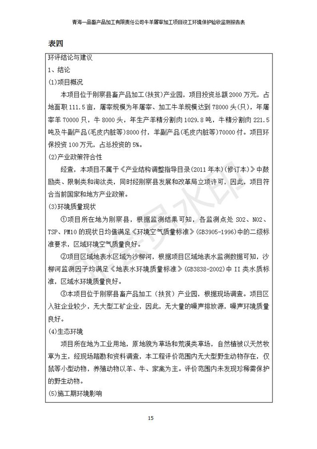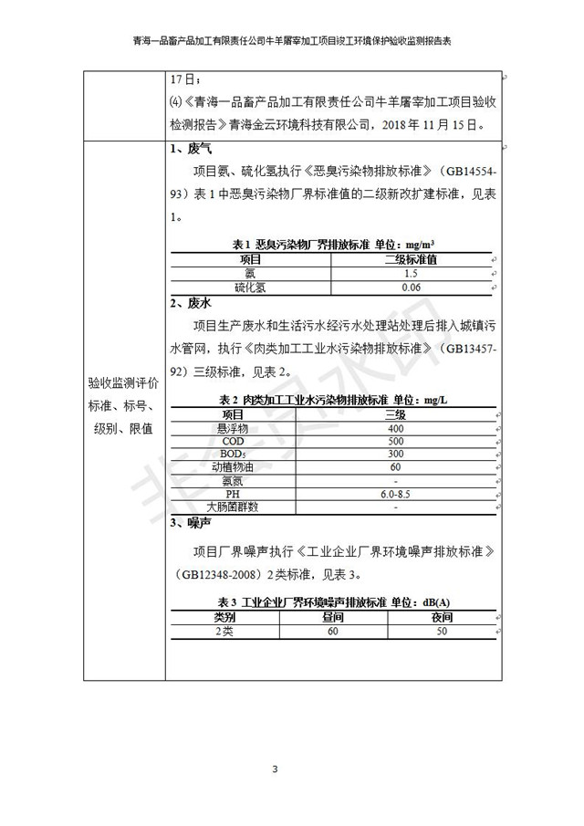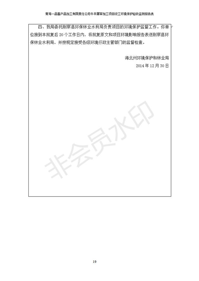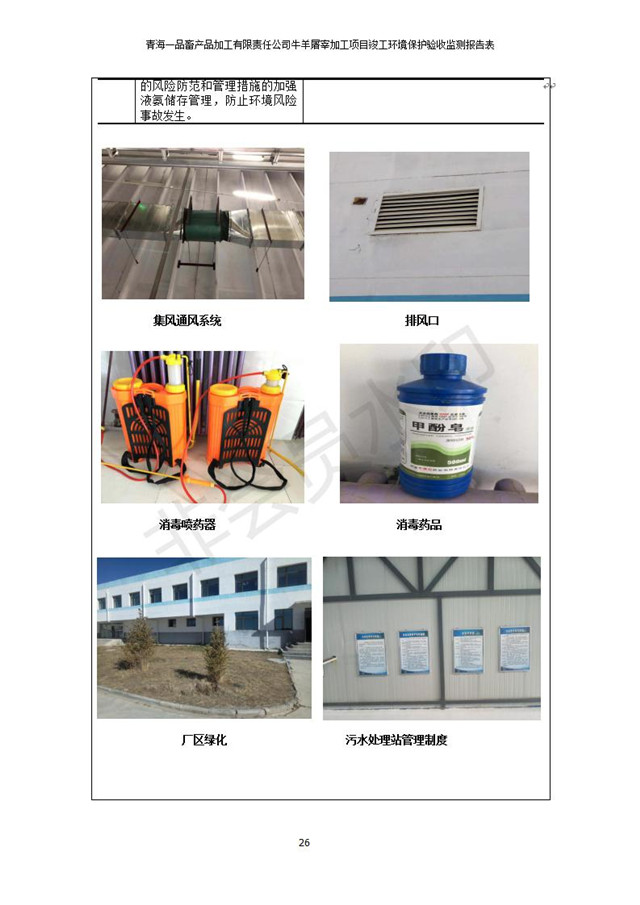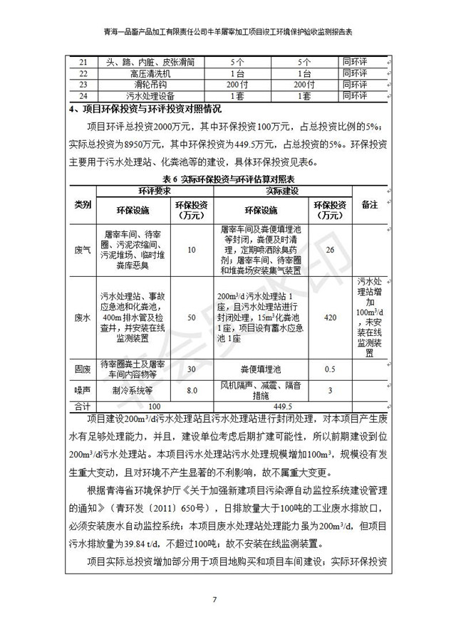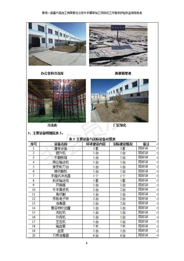 根據(jù)中華人民共和國國務(wù)院令第682號《國務(wù)院關(guān)于修改〈建設(shè)項目環(huán)境保護(hù)管理條例〉的決定》和《建設(shè)項目竣工環(huán)境保護(hù)驗收暫行辦法》(國務(wù)院令682號),青海一品畜產(chǎn)品加工有限責(zé)任公司牛羊屠宰加工項目(包括竣工環(huán)境保護(hù)驗收監(jiān)測報告表和驗收意見)公示如下。 一、項目名稱:青海一品畜產(chǎn)品加工有限責(zé)任公司牛羊屠宰加工項目竣工環(huán)境保護(hù)驗收監(jiān)測報告表 二、地點(diǎn):剛察縣縣城東大街加油站東側(cè) 三、建設(shè)單位:青海一品畜產(chǎn)品加工有限責(zé)任公司 四、建設(shè)內(nèi)容:項目地面積17453m2,項目建設(shè)內(nèi)容包括牛羊屠宰車間、牛羊肉加工車間、冷庫、辦公區(qū)、污水處理站等。 五、聯(lián)系人:張工 七、公示時間:二〇一九年一月十一日至二〇一九年二月七日 公示期間,對上述公示內(nèi)容如有異議,請以書面形式反饋,個人須署真實姓名,單位須加蓋公章。