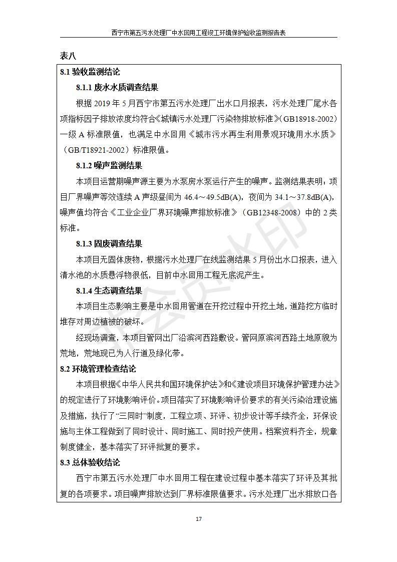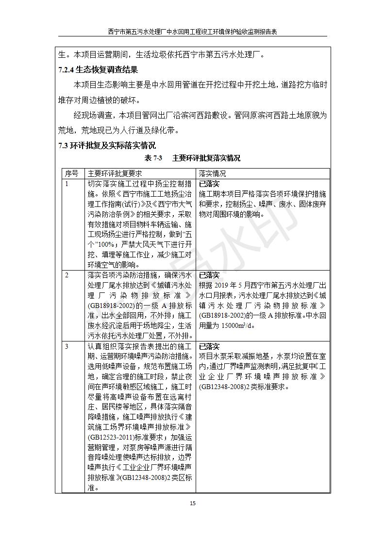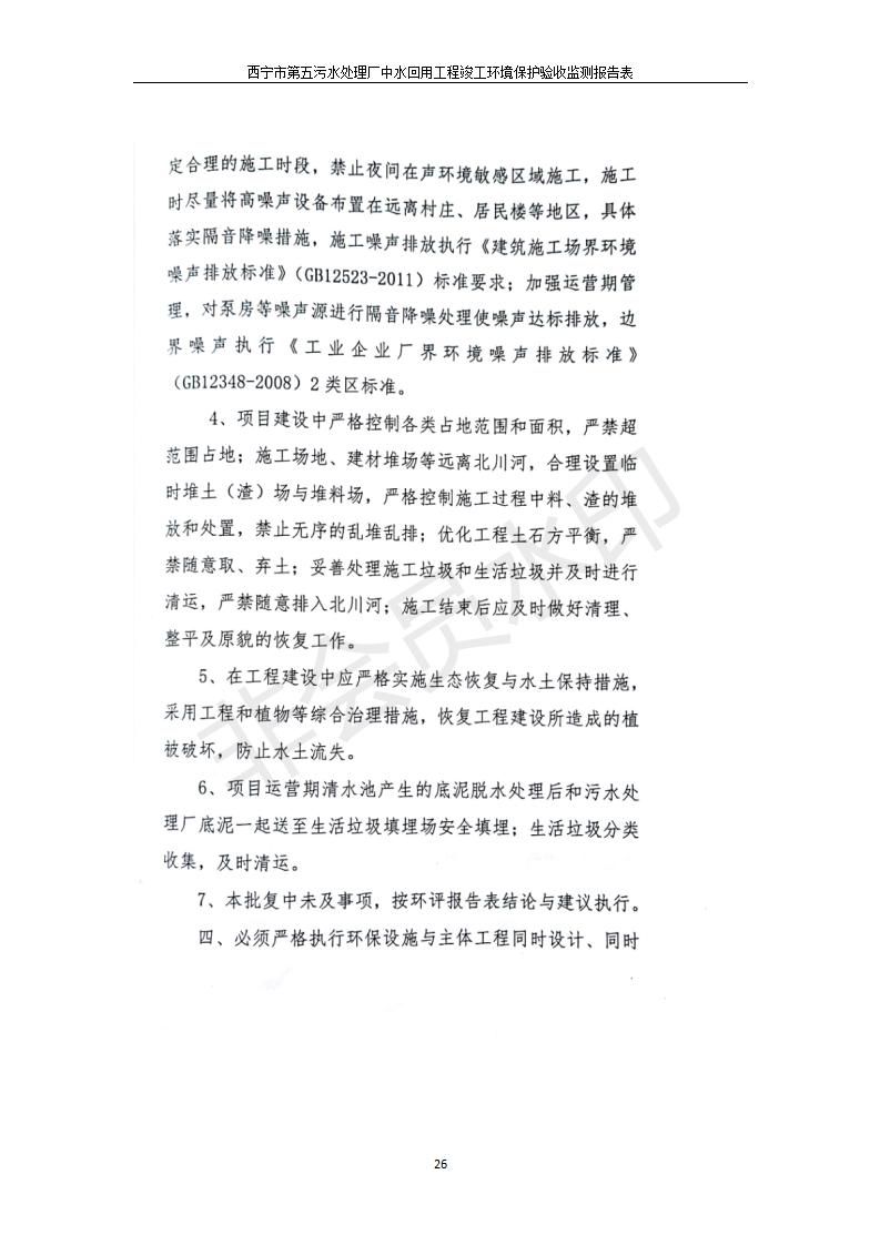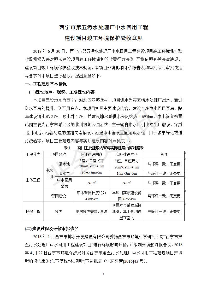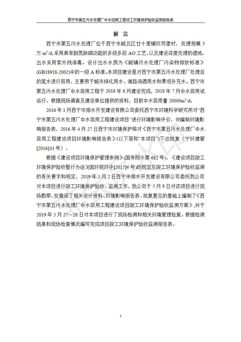 根據(jù)中華人民共和國(guó)國(guó)務(wù)院令第682號(hào)《國(guó)務(wù)院關(guān)于修改〈建設(shè)項(xiàng)目環(huán)境保護(hù)管理?xiàng)l例〉的決定》和《建設(shè)項(xiàng)目竣工環(huán)境保護(hù)驗(yàn)收暫行辦法》(國(guó)務(wù)院令682號(hào)),西寧市第五污水處理廠(chǎng)中水回用工程建設(shè)項(xiàng)目(包括竣工環(huán)境保護(hù)驗(yàn)收監(jiān)測(cè)報(bào)告表和驗(yàn)收意見(jiàn))公示如下。 一、項(xiàng)目名稱(chēng):西寧市第五污水處理廠(chǎng)中水回用工程建設(shè)項(xiàng)目 二、地點(diǎn):西寧市城北區(qū)廿十里鋪雙蘇堡 三、建設(shè)單位:西寧市排水開(kāi)發(fā)建設(shè)有限公司