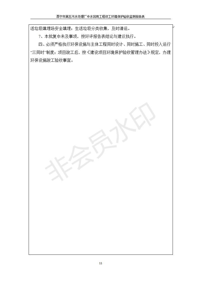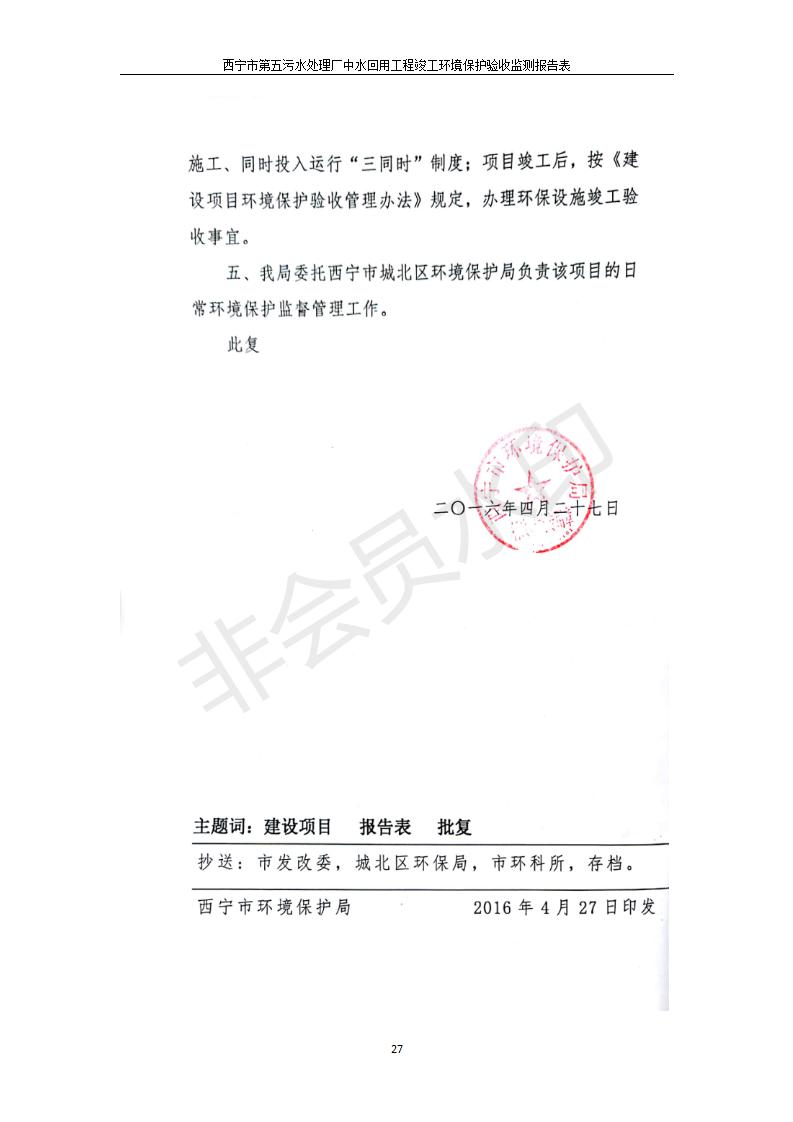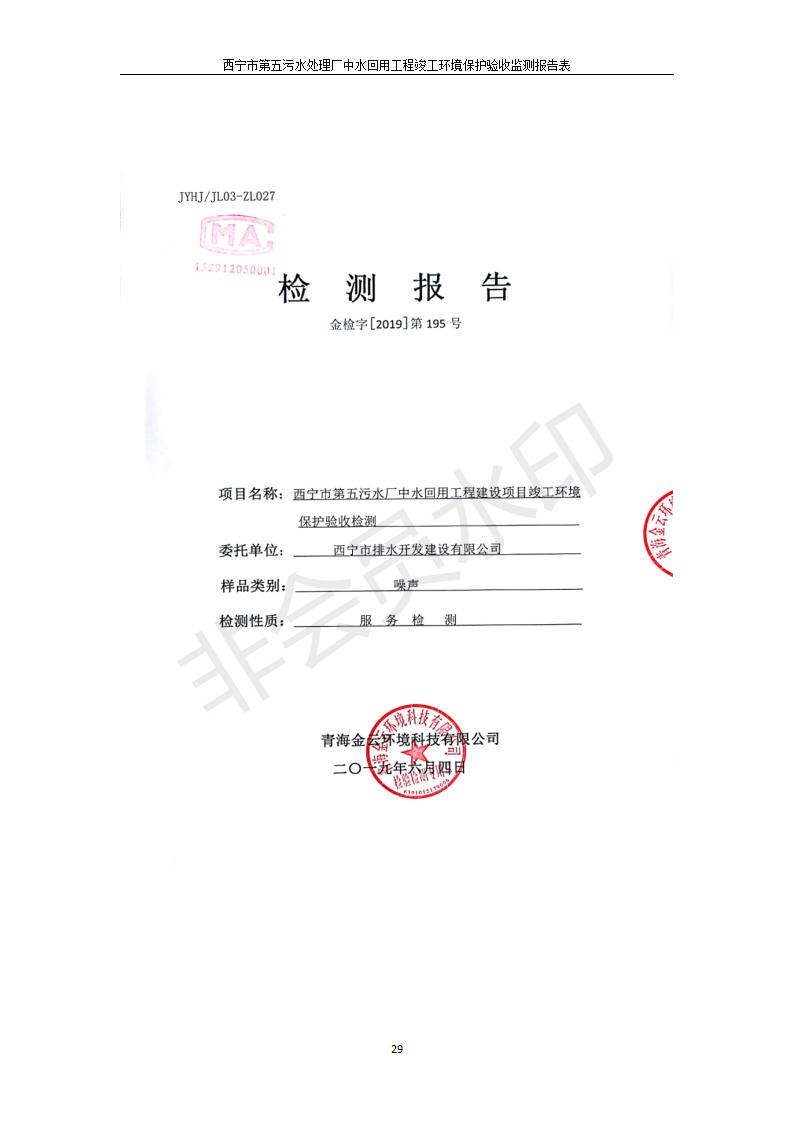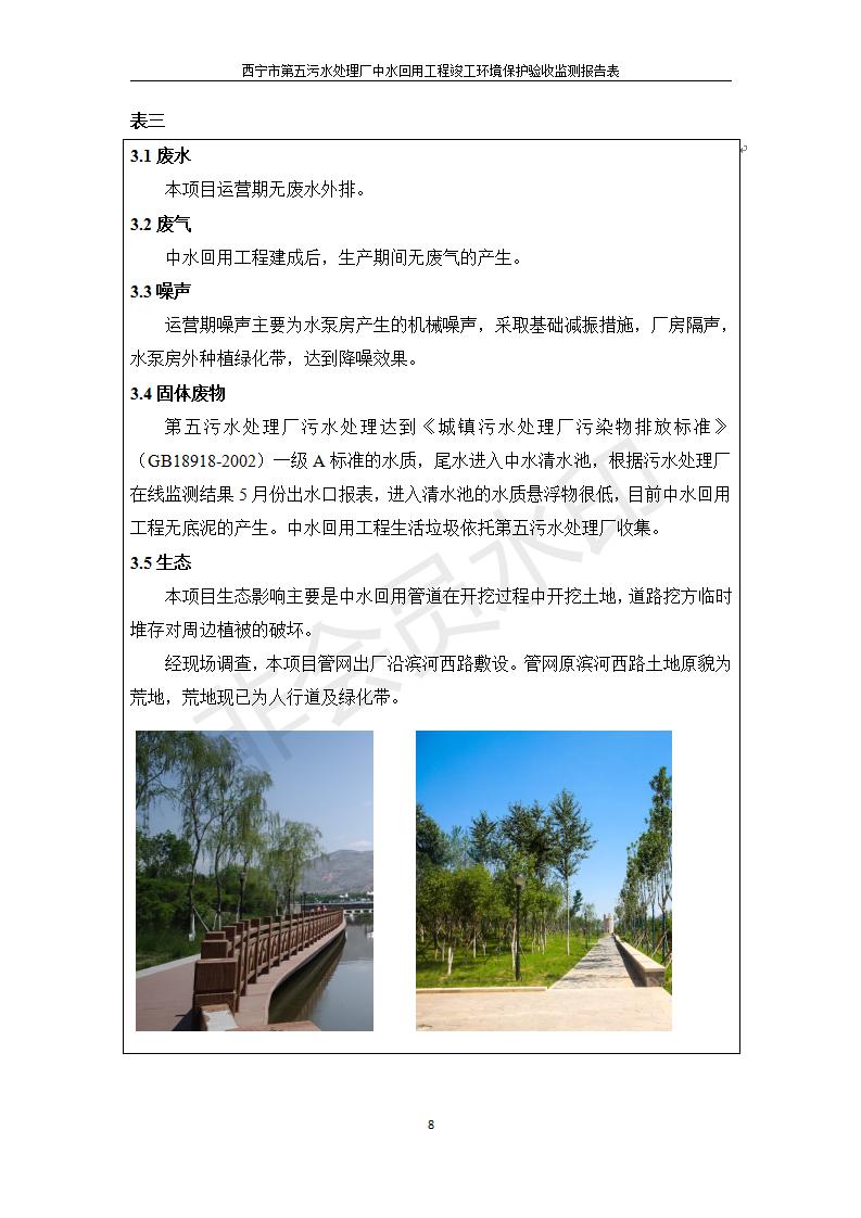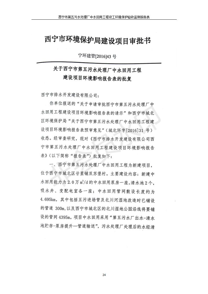 根據(jù)中華人民共和國(guó)國(guó)務(wù)院令第682號(hào)《國(guó)務(wù)院關(guān)于修改〈建設(shè)項(xiàng)目環(huán)境保護(hù)管理?xiàng)l例〉的決定》和《建設(shè)項(xiàng)目竣工環(huán)境保護(hù)驗(yàn)收暫行辦法》(國(guó)務(wù)院令682號(hào)),西寧市第五污水處理廠(chǎng)中水回用工程建設(shè)項(xiàng)目(包括竣工環(huán)境保護(hù)驗(yàn)收監(jiān)測(cè)報(bào)告表和驗(yàn)收意見(jiàn))公示如下。 一、項(xiàng)目名稱(chēng):西寧市第五污水處理廠(chǎng)中水回用工程建設(shè)項(xiàng)目 二、地點(diǎn):西寧市城北區(qū)廿十里鋪雙蘇堡 三、建設(shè)單位:西寧市排水開(kāi)發(fā)建設(shè)有限公司
