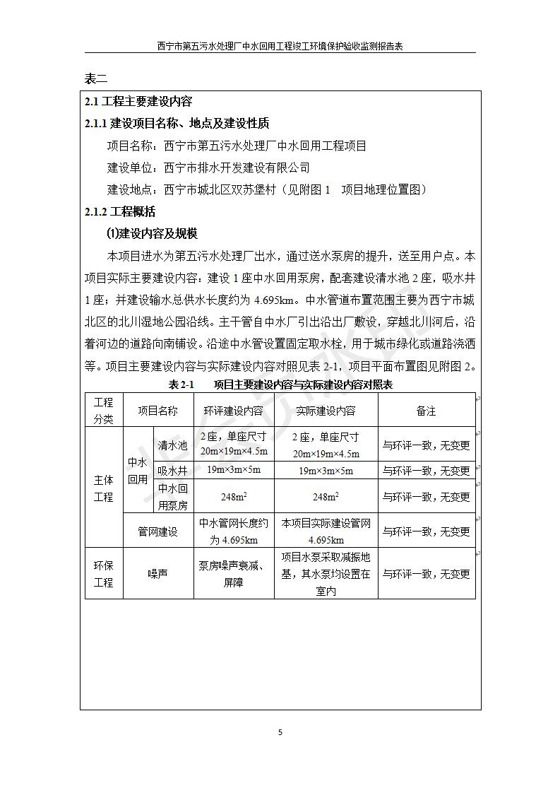 四、建設(shè)內(nèi)容:本項(xiàng)目進(jìn)水為第五污水處理廠(chǎng)出水,通過(guò)送水泵房的提升,送至用戶(hù)點(diǎn)。本項(xiàng)目實(shí)際主要建設(shè)內(nèi)容:建設(shè)1座中水回用泵房,配套建設(shè)清水池2座,吸水井1座;并建設(shè)輸水總供水長(zhǎng)度約為4.695km。中水管道布置范圍主要為西寧市城北區(qū)的北川濕地公園沿線(xiàn)。 六、聯(lián)系電 話(huà):0971-6515411 七、公示時(shí)間:二〇一九年七月十日至二〇一九年八月六日 公示期間,對(duì)上述公示內(nèi)容如有異議,請(qǐng)以書(shū)面形式反饋,個(gè)人須署真實(shí)姓名,單位須加蓋公章。