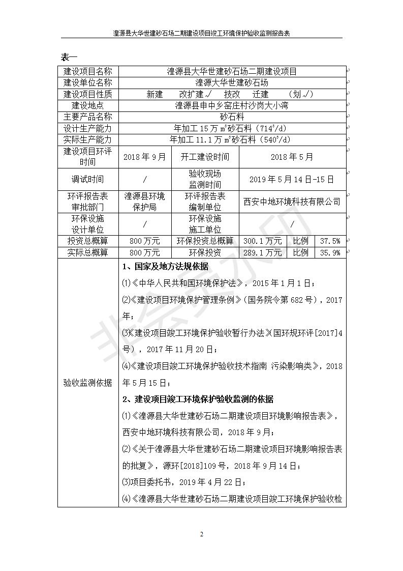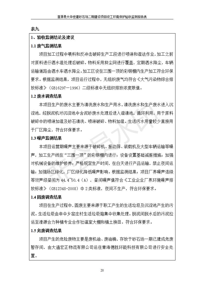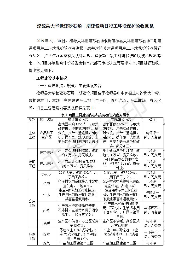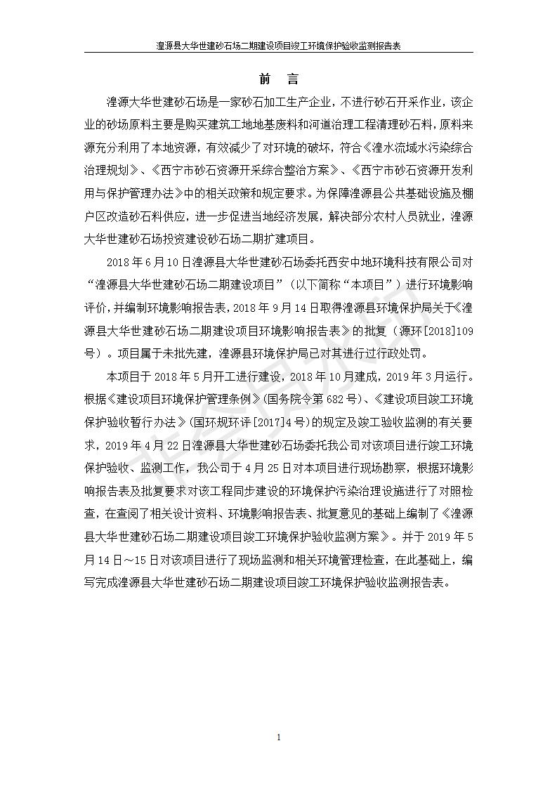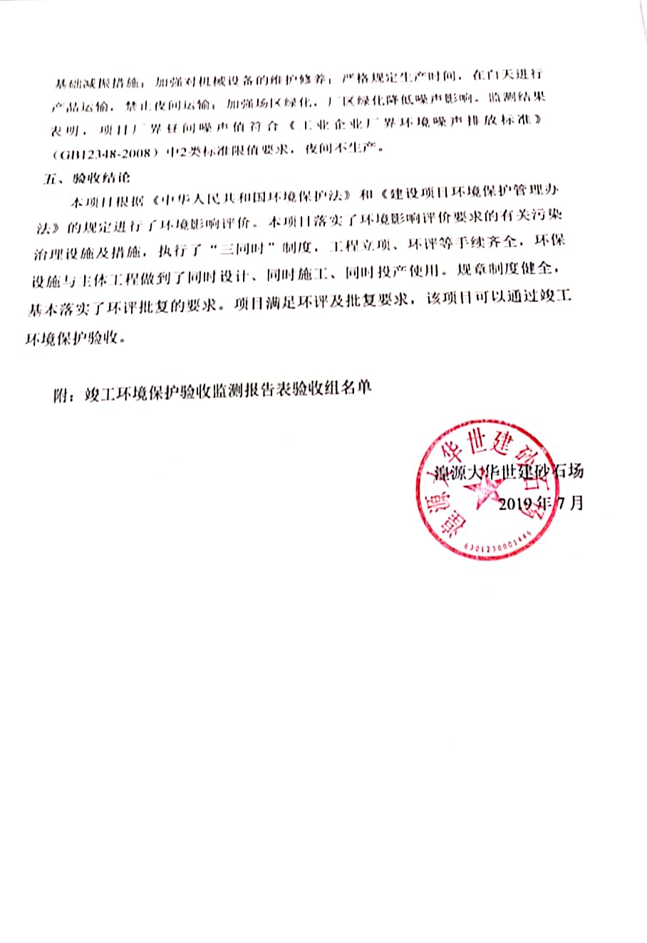 根據(jù)中華人民共和國國務(wù)院令第682號(hào)《國務(wù)院關(guān)于修改〈建設(shè)項(xiàng)目環(huán)境保護(hù)管理?xiàng)l例〉的決定》和《建設(shè)項(xiàng)目竣工環(huán)境保護(hù)驗(yàn)收暫行辦法》(國務(wù)院令682號(hào)),湟源大華世建砂石場湟源縣大華世建砂石場二期建設(shè)項(xiàng)目(包括竣工環(huán)境保護(hù)驗(yàn)收監(jiān)測報(bào)告表和驗(yàn)收意見)公示如下。 一、項(xiàng)目名稱:湟源縣大華世建砂石場二期建設(shè)項(xiàng)目 二、地點(diǎn):湟源縣申中鄉(xiāng)窯莊村沙崗大小灣 三、建設(shè)單位:湟源大華世建砂石場 四、建設(shè)內(nèi)容:項(xiàng)目主要建設(shè)砂石料產(chǎn)品加工生產(chǎn)區(qū)、原料堆場、產(chǎn)品堆場、辦公區(qū)等。五、聯(lián)系人:張工 六、聯(lián)系電 話:0971-6515411 七、公示時(shí)間:二〇一九年七月二十五日至二〇一九年八月二十一日公示期間,對(duì)上述公示內(nèi)容如有異議,請(qǐng)以書面形式反饋,個(gè)人須署真實(shí)姓名,單位須加蓋公章。