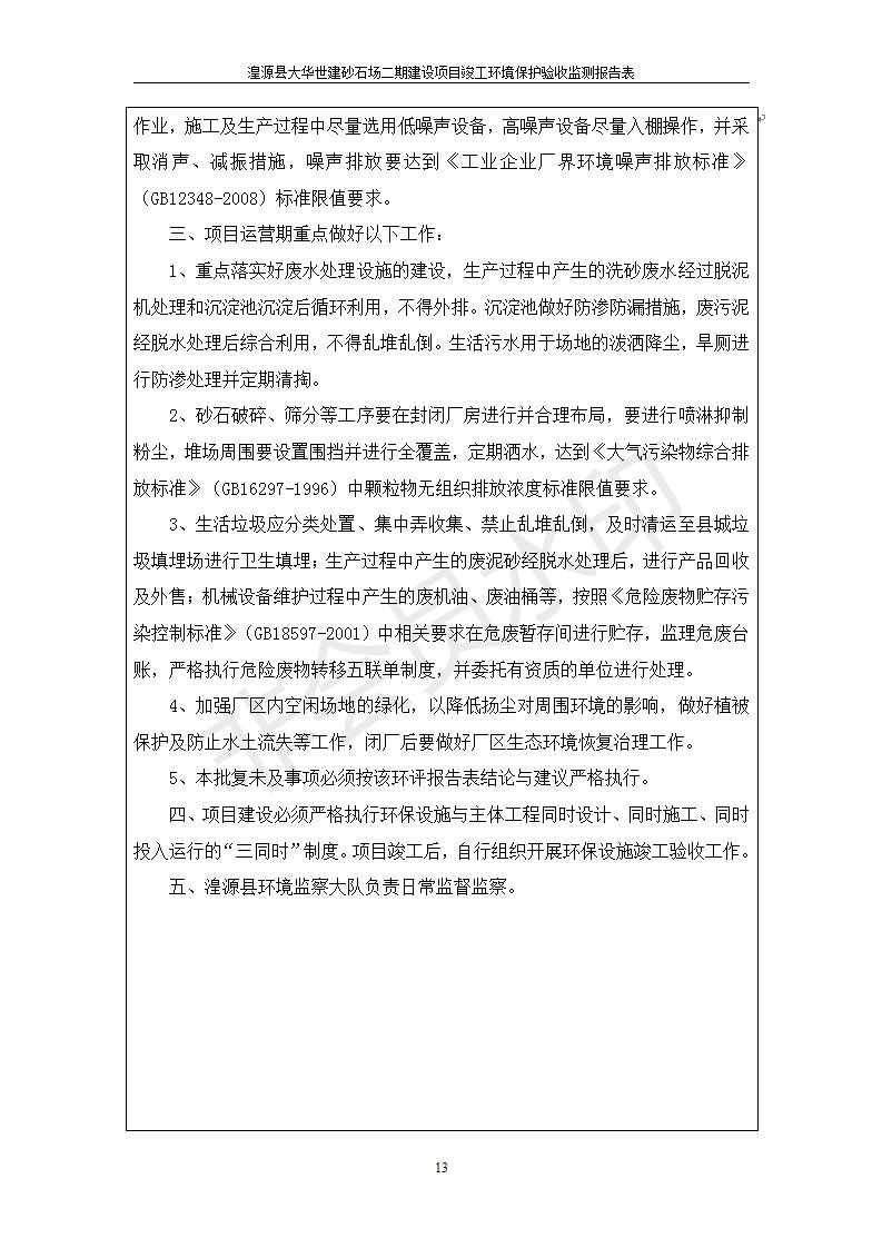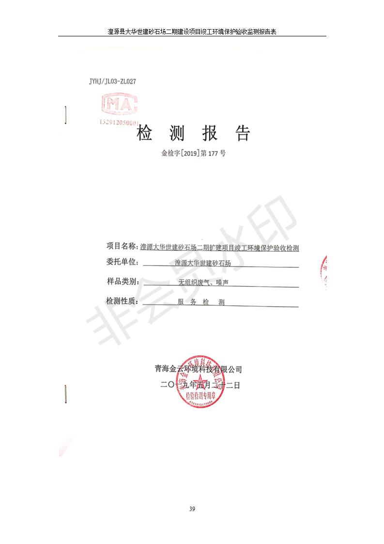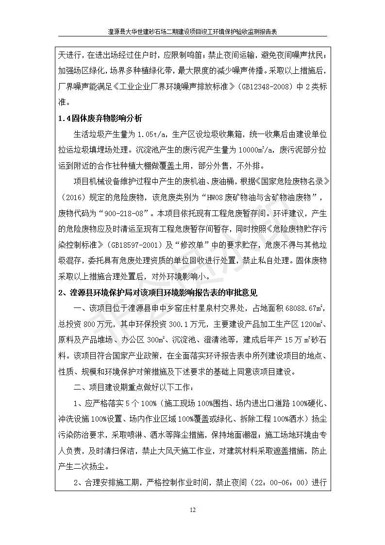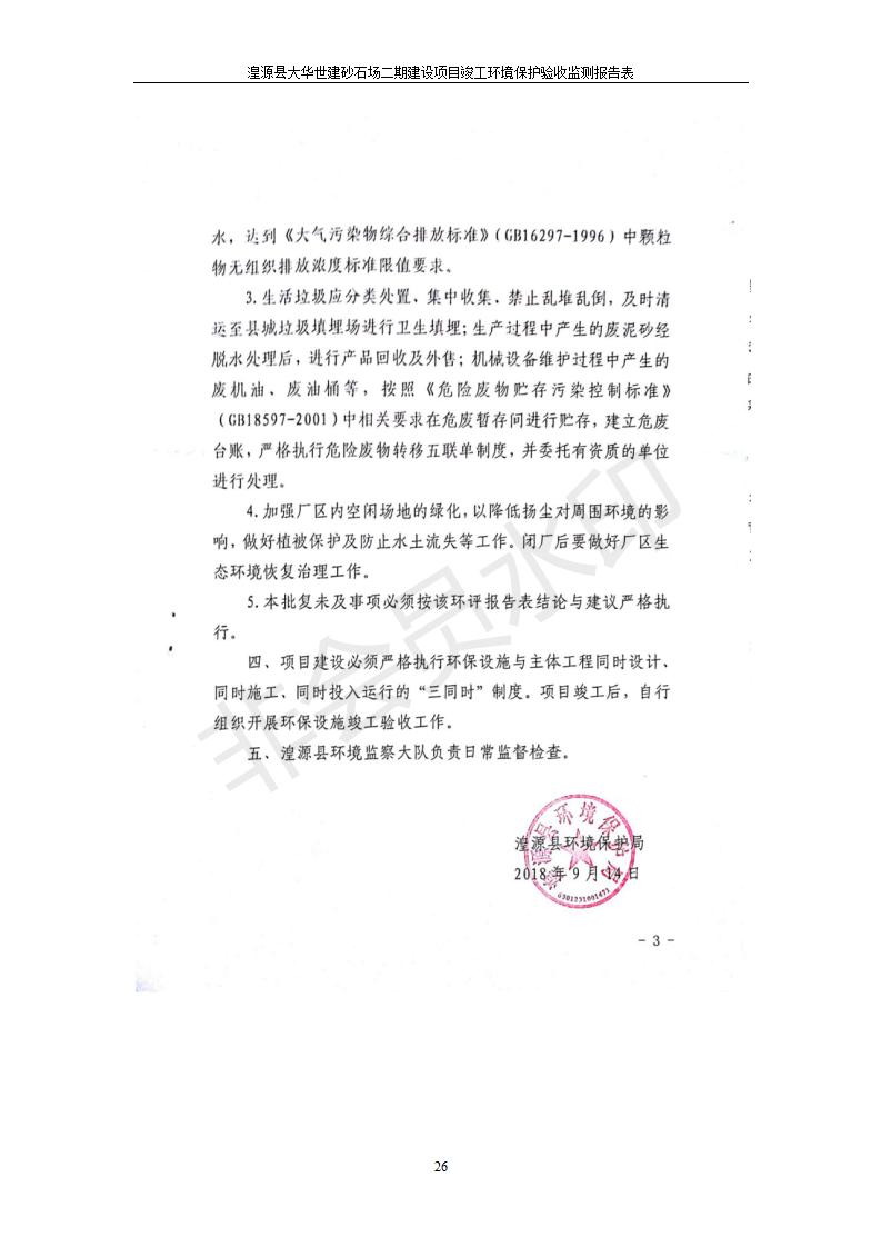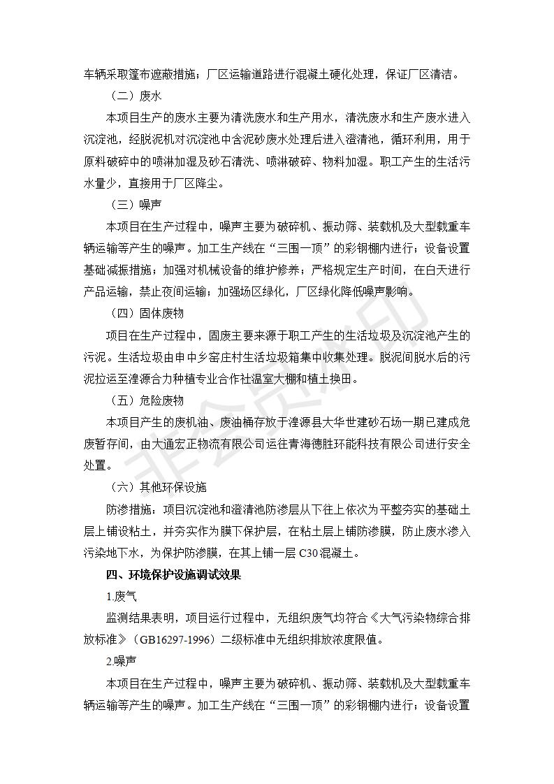 根據(jù)中華人民共和國國務(wù)院令第682號(hào)《國務(wù)院關(guān)于修改〈建設(shè)項(xiàng)目環(huán)境保護(hù)管理?xiàng)l例〉的決定》和《建設(shè)項(xiàng)目竣工環(huán)境保護(hù)驗(yàn)收暫行辦法》(國務(wù)院令682號(hào)),湟源大華世建砂石場湟源縣大華世建砂石場二期建設(shè)項(xiàng)目(包括竣工環(huán)境保護(hù)驗(yàn)收監(jiān)測報(bào)告表和驗(yàn)收意見)公示如下。 一、項(xiàng)目名稱:湟源縣大華世建砂石場二期建設(shè)項(xiàng)目 二、地點(diǎn):湟源縣申中鄉(xiāng)窯莊村沙崗大小灣 三、建設(shè)單位:湟源大華世建砂石場 四、建設(shè)內(nèi)容:項(xiàng)目主要建設(shè)砂石料產(chǎn)品加工生產(chǎn)區(qū)、原料堆場、產(chǎn)品堆場、辦公區(qū)等。五、聯(lián)系人:張工 六、聯(lián)系電 話:0971-6515411 七、公示時(shí)間:二〇一九年七月二十五日至二〇一九年八月二十一日公示期間,對(duì)上述公示內(nèi)容如有異議,請(qǐng)以書面形式反饋,個(gè)人須署真實(shí)姓名,單位須加蓋公章。