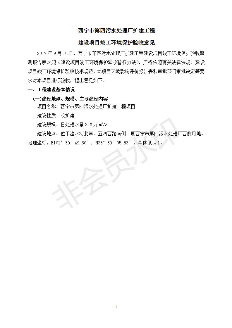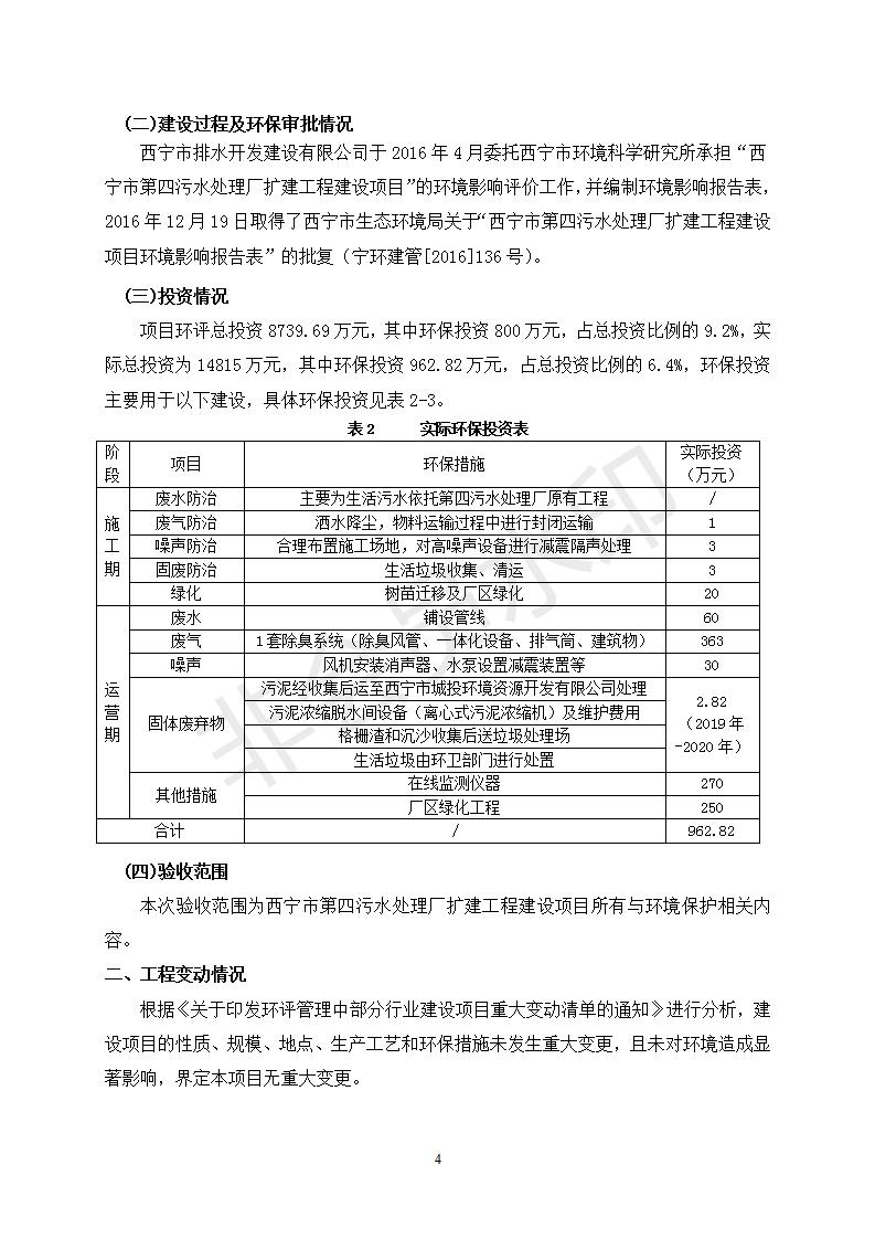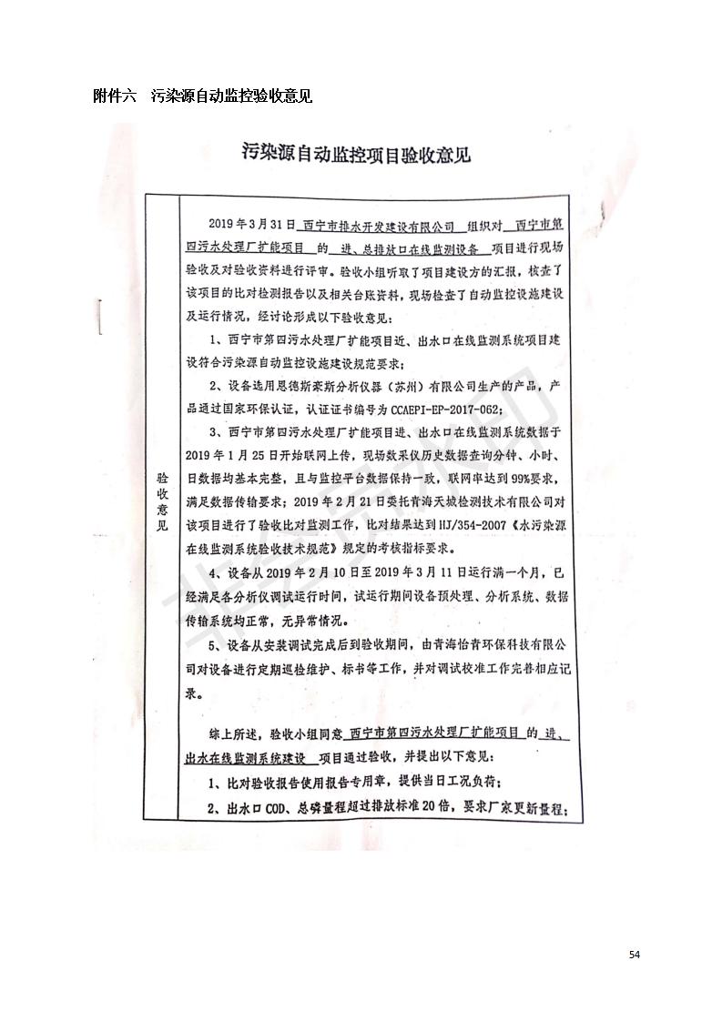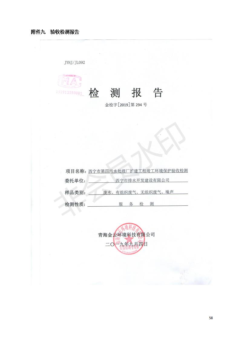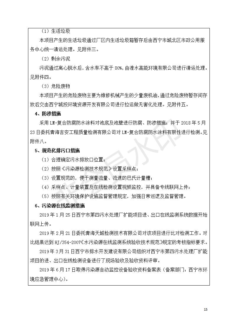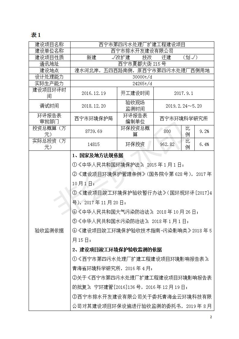 根據中華人民共和國國務院令第682號《國務院關于修改〈建設項目環(huán)境保護管理條例〉的決定》和《建設項目竣工環(huán)境保護驗收暫行辦法》(國務院令682號),西寧市第四污水處理廠擴建工程建設項目(包括竣工環(huán)境保護驗收監(jiān)測報告表和驗收意見)公示如下。 一、項目名稱:西寧市第四污水處理廠擴建工程建設項目 二、地點:五四西路南側,原西寧市第四污水處理廠西側用地 三、建設單位:西寧市排水開發(fā)建設有限公司 四、建設內容:第四污水處理廠擴建工程五、聯(lián)系人:張工 六、聯(lián)系電 話:0971-6515411 七、公示時間:二〇一九年九月十七日至二〇一九年十月十八日公示期間,對上述公示內容如有異議,請以書面形式反饋,個人須署真實姓名,單位須加蓋公章。