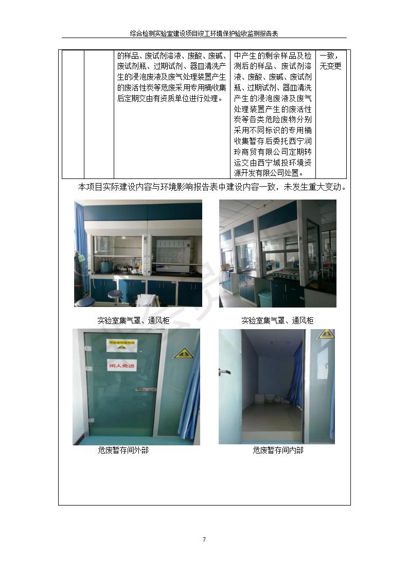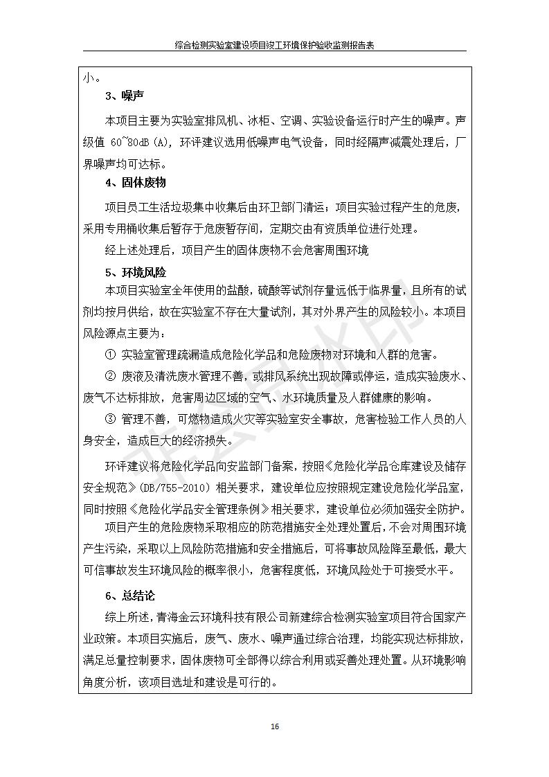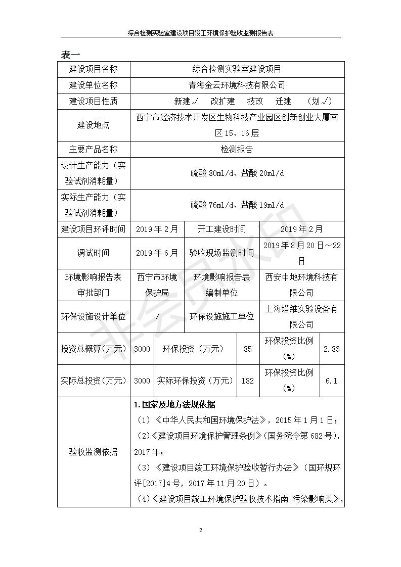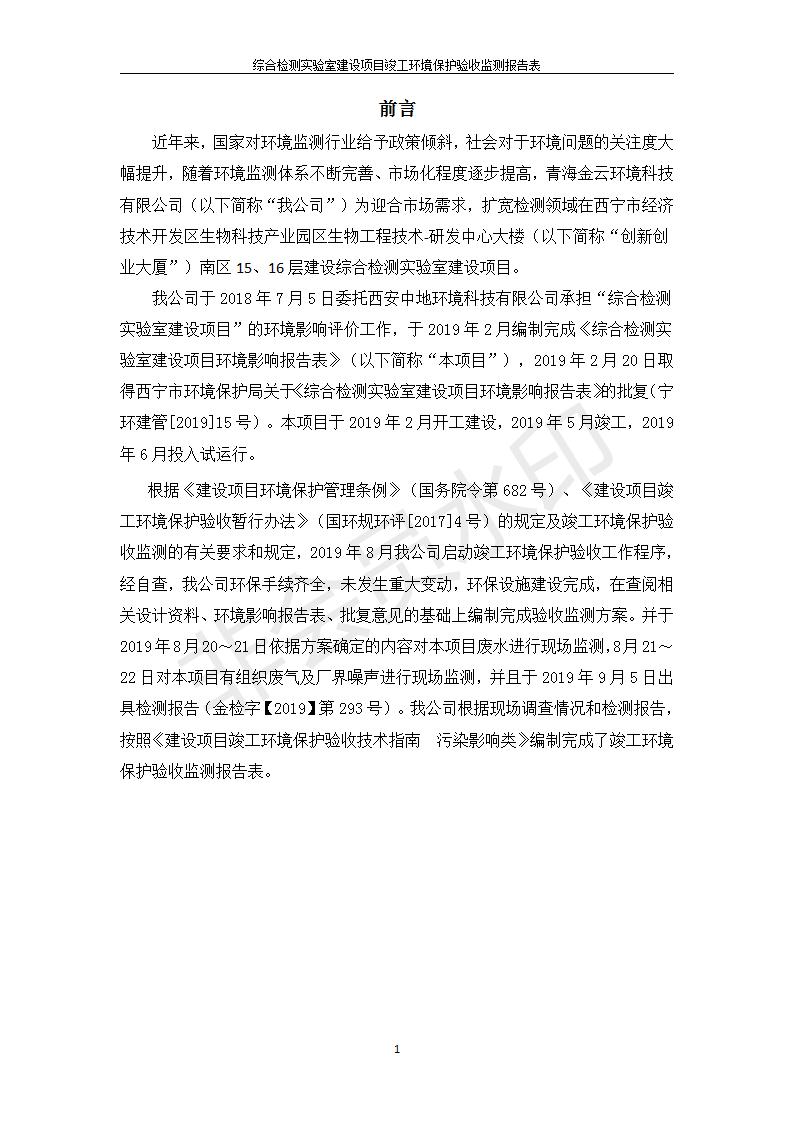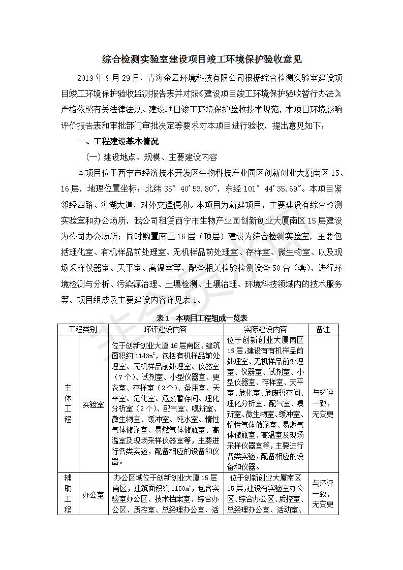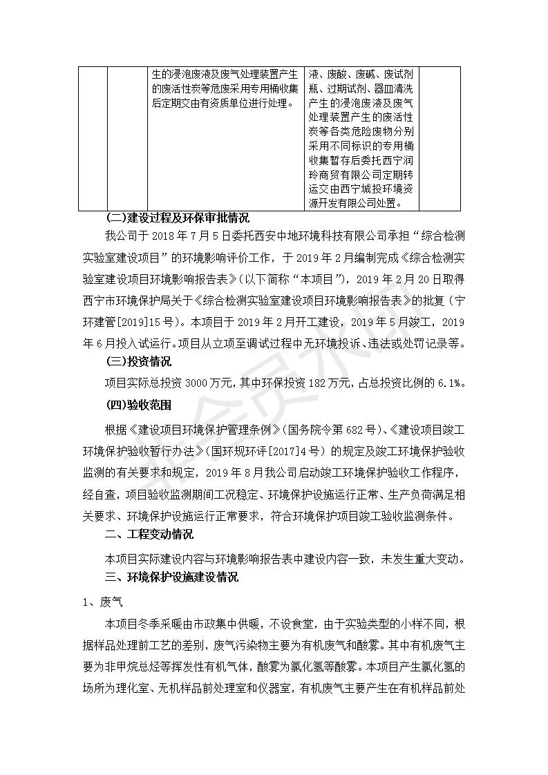 根據(jù)中華人民共和國(guó)國(guó)務(wù)院令第682號(hào)《國(guó)務(wù)院關(guān)于修改〈建設(shè)項(xiàng)目環(huán)境保護(hù)管理?xiàng)l例〉的決定》和《建設(shè)項(xiàng)目竣工環(huán)境保護(hù)驗(yàn)收暫行辦法》(國(guó)務(wù)院令682號(hào)),綜合檢測(cè)實(shí)驗(yàn)室建設(shè)項(xiàng)目(包括竣工環(huán)境保護(hù)驗(yàn)收監(jiān)測(cè)報(bào)告表和驗(yàn)收意見(jiàn))公示如下。 一、項(xiàng)目名稱:綜合檢測(cè)實(shí)驗(yàn)室建設(shè)項(xiàng)目 二、地點(diǎn):西寧市經(jīng)濟(jì)技術(shù)開(kāi)發(fā)區(qū)生物科技產(chǎn)業(yè)園區(qū)創(chuàng)新創(chuàng)業(yè)大廈南區(qū)15、16層 六、聯(lián)系電話:0971-6515411 七、公示時(shí)間:二〇一九年十一月十九日至二〇一九年十二月十六日 公示期間,對(duì)上述公示內(nèi)容如有異議,請(qǐng)以書面形式反饋,個(gè)人須署真實(shí)姓名,單位須加蓋公章。