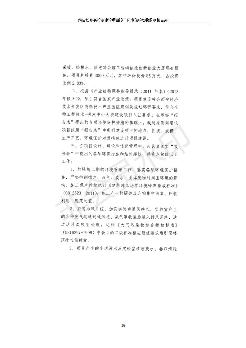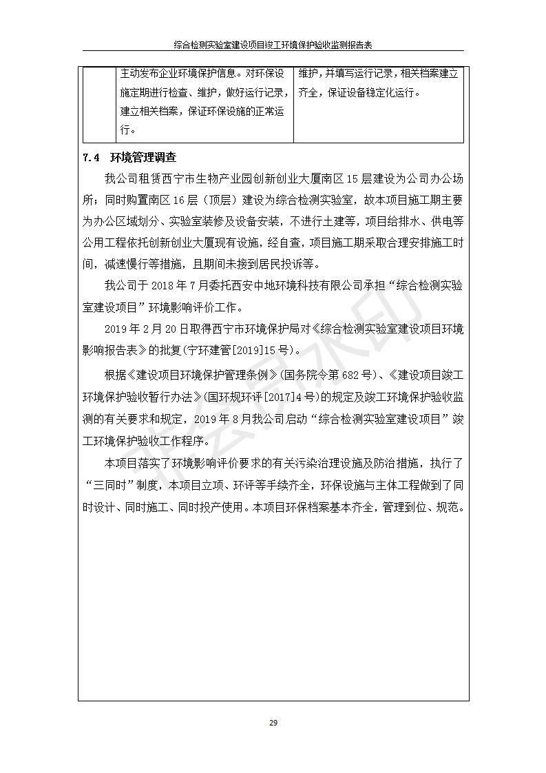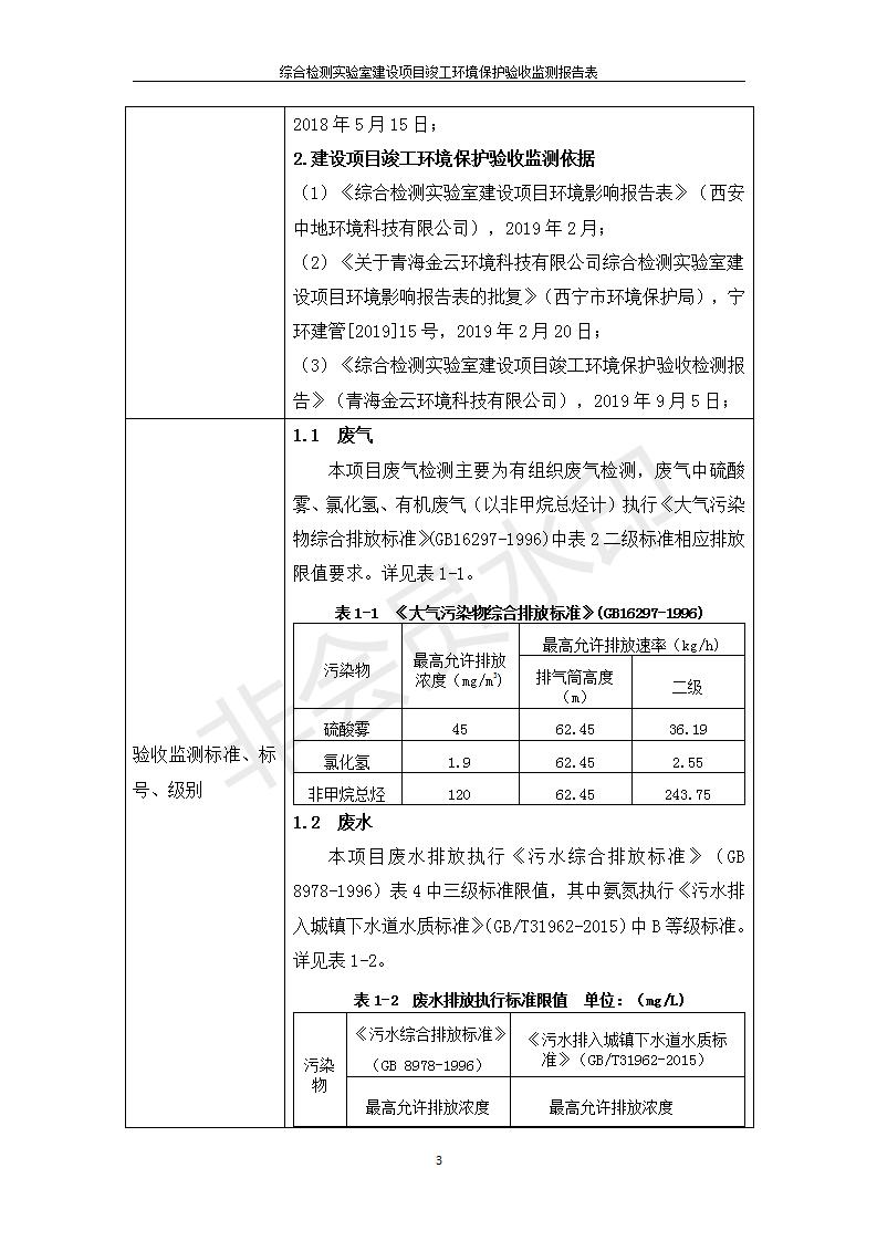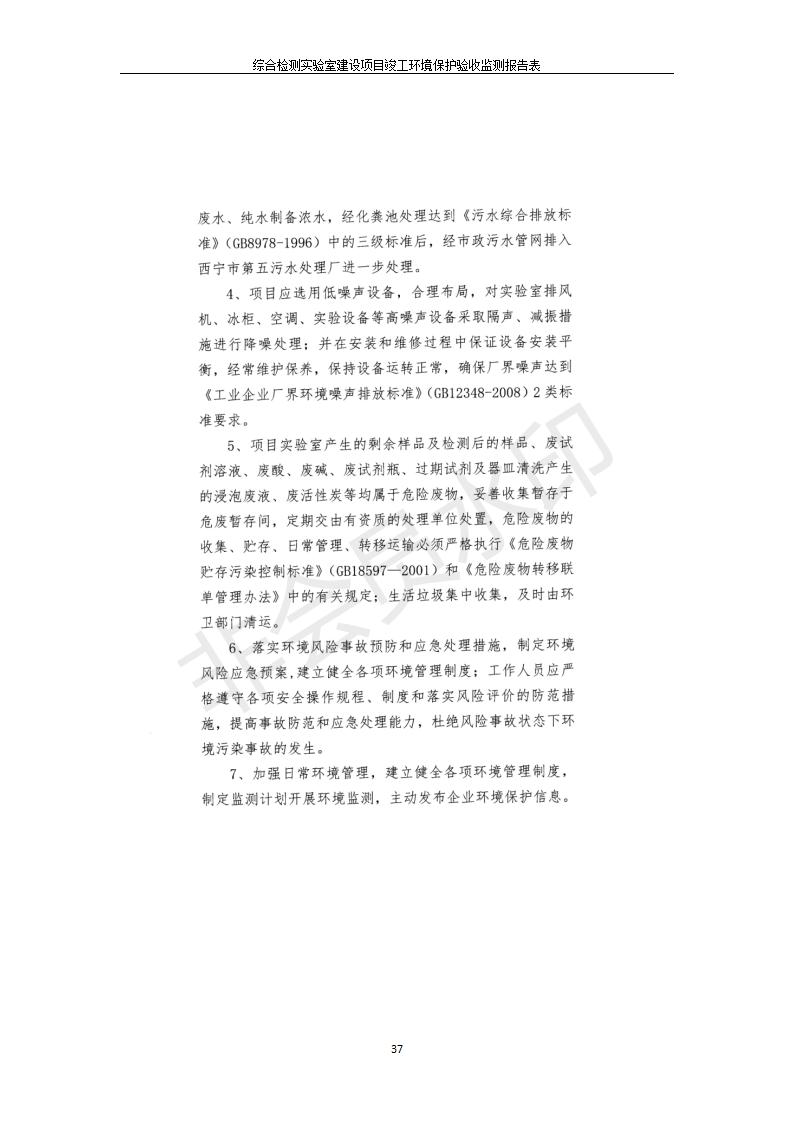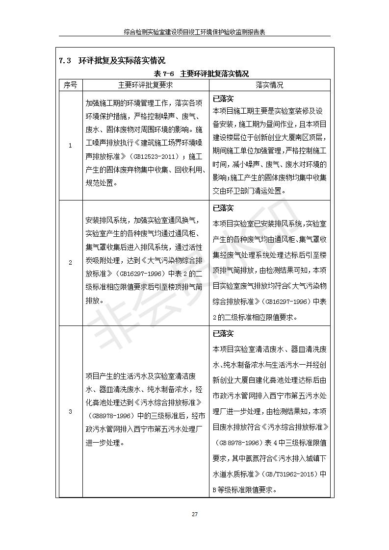 根據(jù)中華人民共和國(guó)國(guó)務(wù)院令第682號(hào)《國(guó)務(wù)院關(guān)于修改〈建設(shè)項(xiàng)目環(huán)境保護(hù)管理?xiàng)l例〉的決定》和《建設(shè)項(xiàng)目竣工環(huán)境保護(hù)驗(yàn)收暫行辦法》(國(guó)務(wù)院令682號(hào)),綜合檢測(cè)實(shí)驗(yàn)室建設(shè)項(xiàng)目(包括竣工環(huán)境保護(hù)驗(yàn)收監(jiān)測(cè)報(bào)告表和驗(yàn)收意見(jiàn))公示如下。 一、項(xiàng)目名稱:綜合檢測(cè)實(shí)驗(yàn)室建設(shè)項(xiàng)目 二、地點(diǎn):西寧市經(jīng)濟(jì)技術(shù)開(kāi)發(fā)區(qū)生物科技產(chǎn)業(yè)園區(qū)創(chuàng)新創(chuàng)業(yè)大廈南區(qū)15、16層 六、聯(lián)系電話:0971-6515411 七、公示時(shí)間:二〇一九年十一月十九日至二〇一九年十二月十六日 公示期間,對(duì)上述公示內(nèi)容如有異議,請(qǐng)以書面形式反饋,個(gè)人須署真實(shí)姓名,單位須加蓋公章。