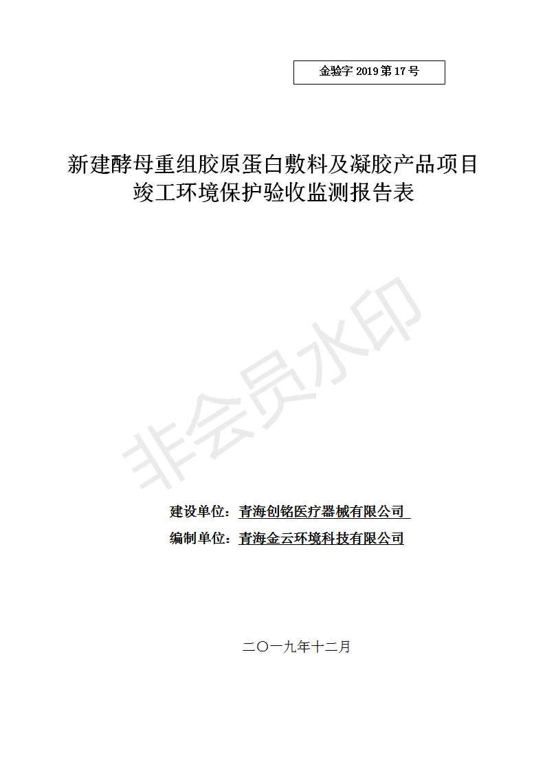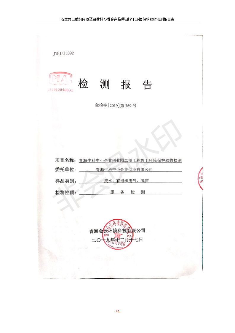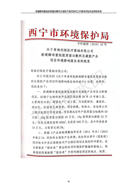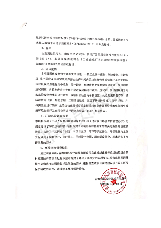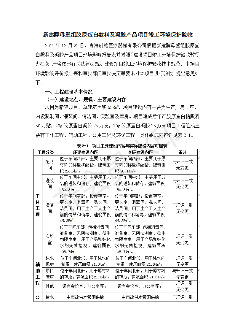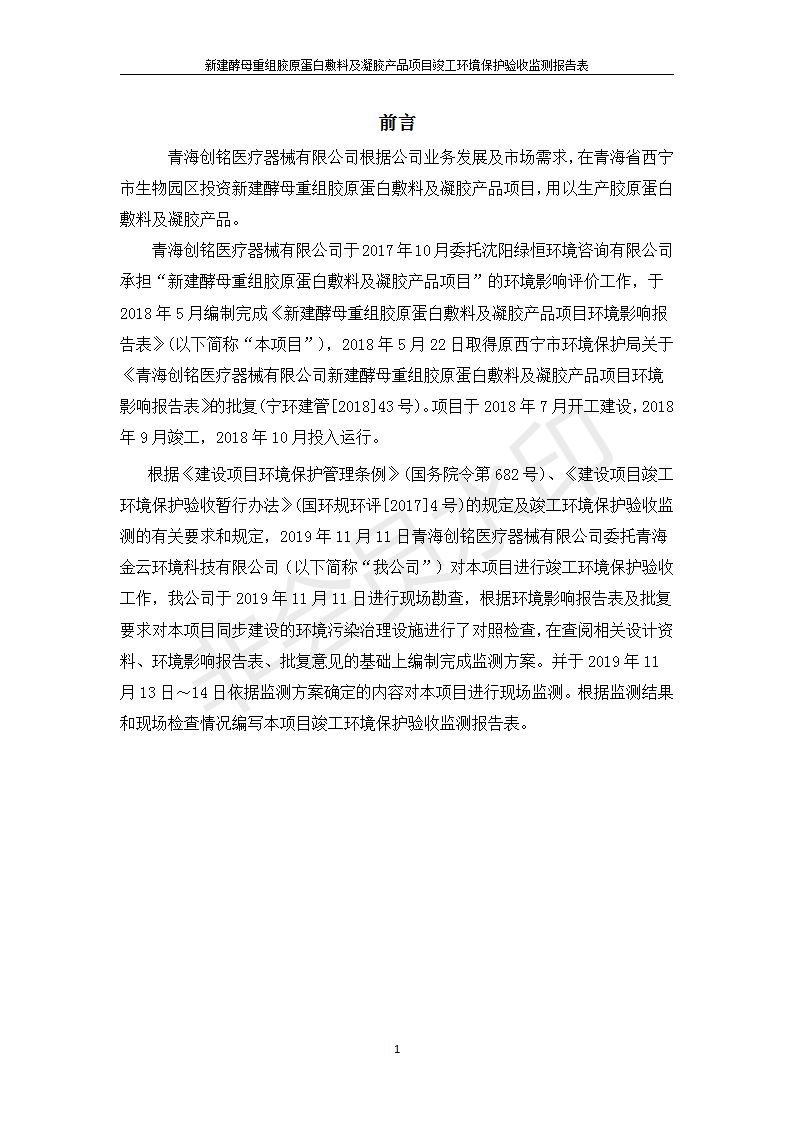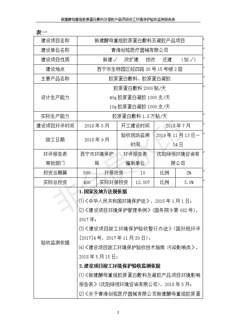 根據(jù)中華人民共和國國務(wù)院令第682號(hào)《國務(wù)院關(guān)于修改〈建設(shè)項(xiàng)目環(huán)境保護(hù)管理?xiàng)l例〉的決定》和《建設(shè)項(xiàng)目竣工環(huán)境保護(hù)驗(yàn)收暫行辦法》(國務(wù)院令682號(hào)),新建酵母重組膠原蛋白敷料及凝膠產(chǎn)品項(xiàng)目(包括竣工環(huán)境保護(hù)驗(yàn)收監(jiān)測(cè)報(bào)告表和驗(yàn)收意見)公示如下。 一、項(xiàng)目名稱:新建酵母重組膠原蛋白敷料及凝膠產(chǎn)品項(xiàng)目 二、地點(diǎn):西寧市生物園區(qū)經(jīng)四路26號(hào)15號(hào)樓2層 五、聯(lián)系人:董繼風(fēng) 六、聯(lián)系電話:18606125050 七、公示時(shí)間:二〇二〇年一月十三日至二〇二〇年二月十二日 公示期間,對(duì)上述公示內(nèi)容如有異議,請(qǐng)以書面形式反饋,個(gè)人須署真實(shí)姓名,單位須加蓋公章。