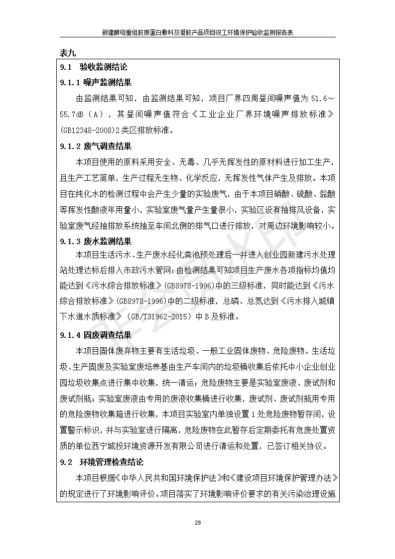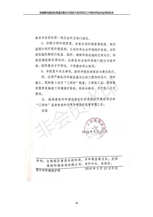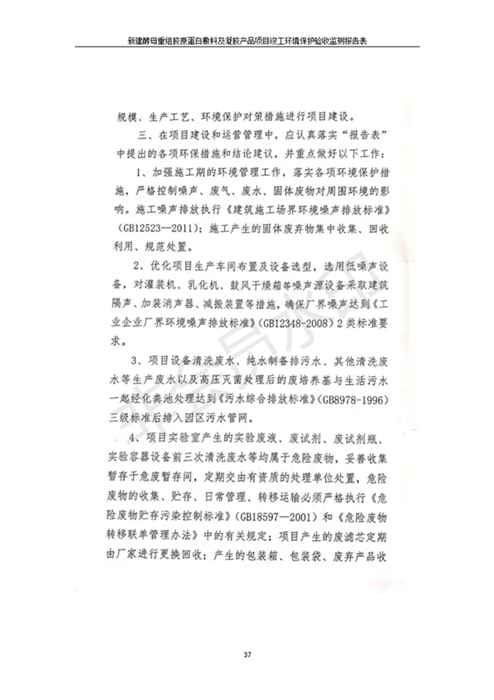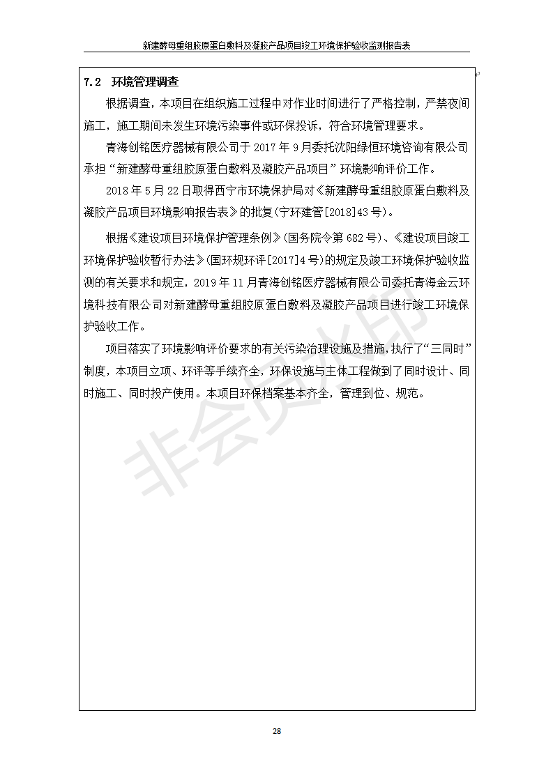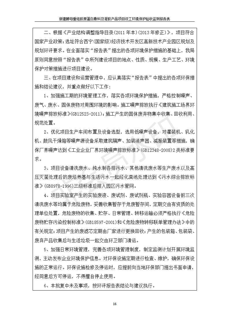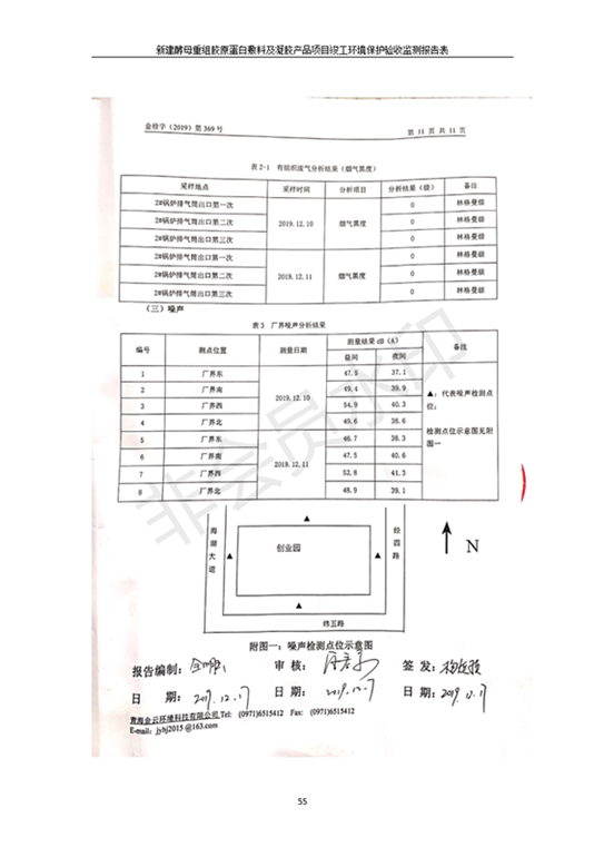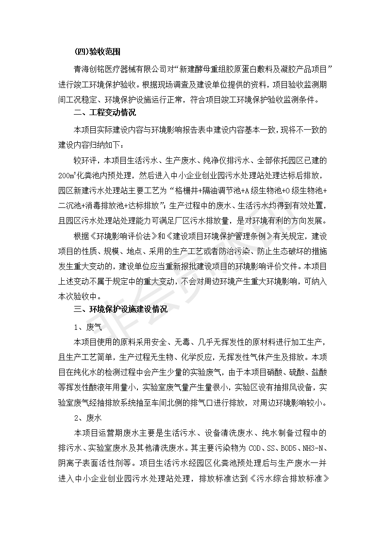 根據(jù)中華人民共和國國務(wù)院令第682號(hào)《國務(wù)院關(guān)于修改〈建設(shè)項(xiàng)目環(huán)境保護(hù)管理?xiàng)l例〉的決定》和《建設(shè)項(xiàng)目竣工環(huán)境保護(hù)驗(yàn)收暫行辦法》(國務(wù)院令682號(hào)),新建酵母重組膠原蛋白敷料及凝膠產(chǎn)品項(xiàng)目(包括竣工環(huán)境保護(hù)驗(yàn)收監(jiān)測(cè)報(bào)告表和驗(yàn)收意見)公示如下。 一、項(xiàng)目名稱:新建酵母重組膠原蛋白敷料及凝膠產(chǎn)品項(xiàng)目 二、地點(diǎn):西寧市生物園區(qū)經(jīng)四路26號(hào)15號(hào)樓2層 五、聯(lián)系人:董繼風(fēng) 六、聯(lián)系電話:18606125050 七、公示時(shí)間:二〇二〇年一月十三日至二〇二〇年二月十二日 公示期間,對(duì)上述公示內(nèi)容如有異議,請(qǐng)以書面形式反饋,個(gè)人須署真實(shí)姓名,單位須加蓋公章。