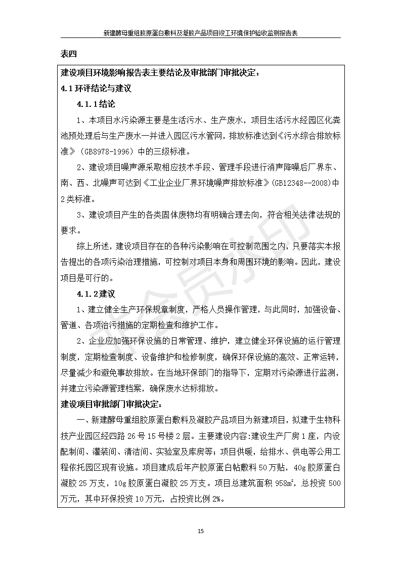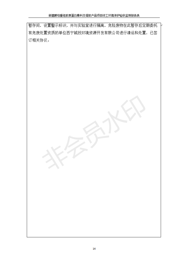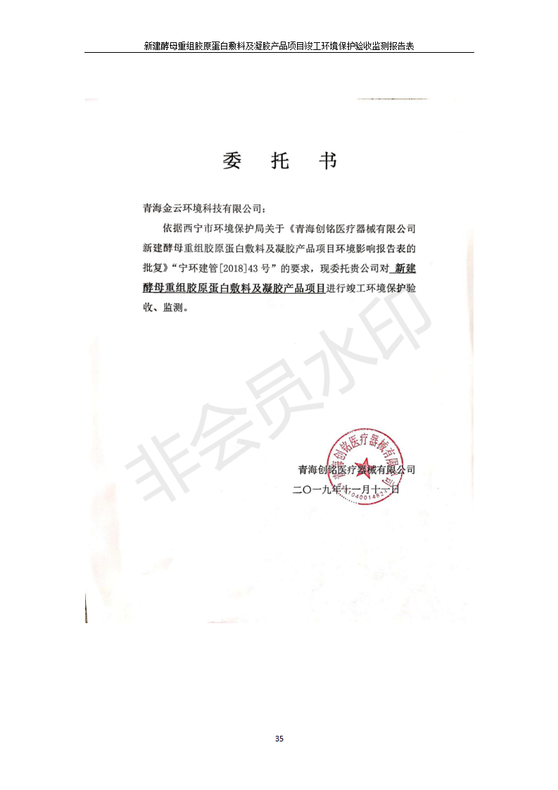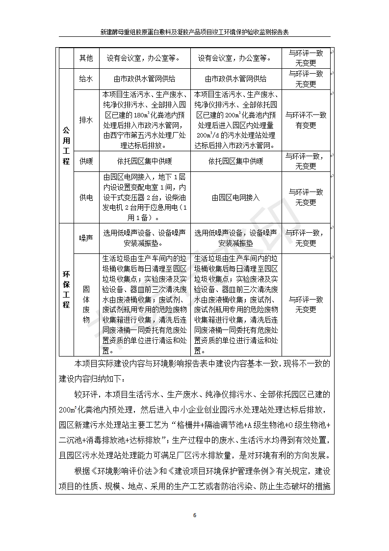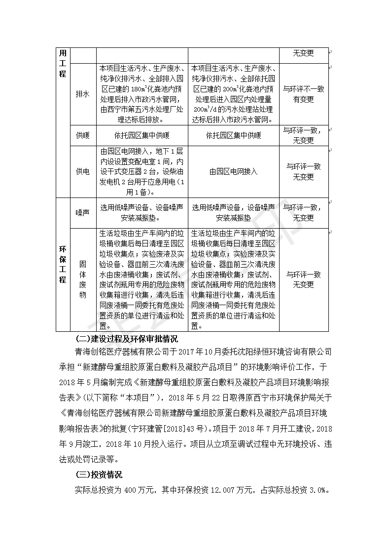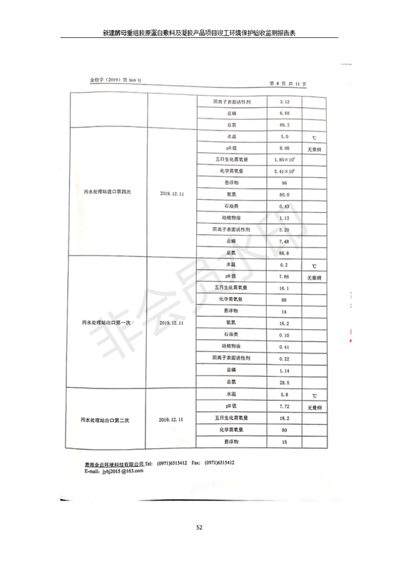 根據(jù)中華人民共和國國務(wù)院令第682號(hào)《國務(wù)院關(guān)于修改〈建設(shè)項(xiàng)目環(huán)境保護(hù)管理?xiàng)l例〉的決定》和《建設(shè)項(xiàng)目竣工環(huán)境保護(hù)驗(yàn)收暫行辦法》(國務(wù)院令682號(hào)),新建酵母重組膠原蛋白敷料及凝膠產(chǎn)品項(xiàng)目(包括竣工環(huán)境保護(hù)驗(yàn)收監(jiān)測(cè)報(bào)告表和驗(yàn)收意見)公示如下。 一、項(xiàng)目名稱:新建酵母重組膠原蛋白敷料及凝膠產(chǎn)品項(xiàng)目 二、地點(diǎn):西寧市生物園區(qū)經(jīng)四路26號(hào)15號(hào)樓2層 五、聯(lián)系人:董繼風(fēng) 六、聯(lián)系電話:18606125050 七、公示時(shí)間:二〇二〇年一月十三日至二〇二〇年二月十二日 公示期間,對(duì)上述公示內(nèi)容如有異議,請(qǐng)以書面形式反饋,個(gè)人須署真實(shí)姓名,單位須加蓋公章。