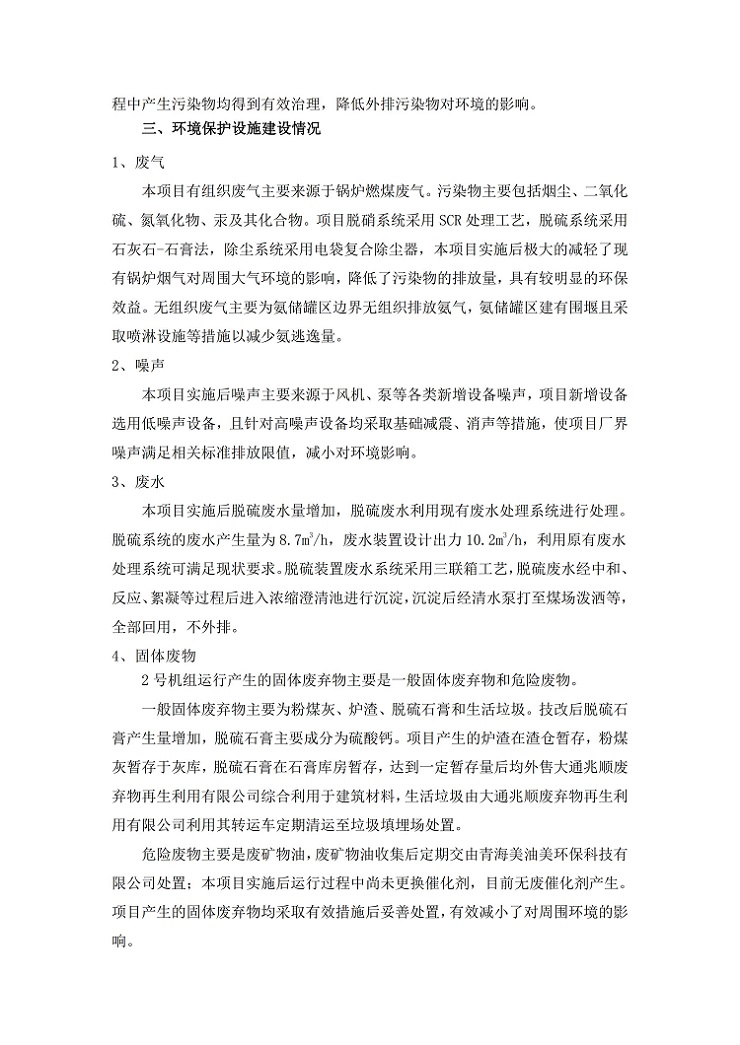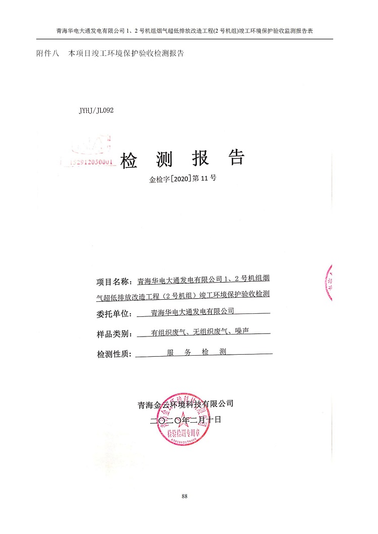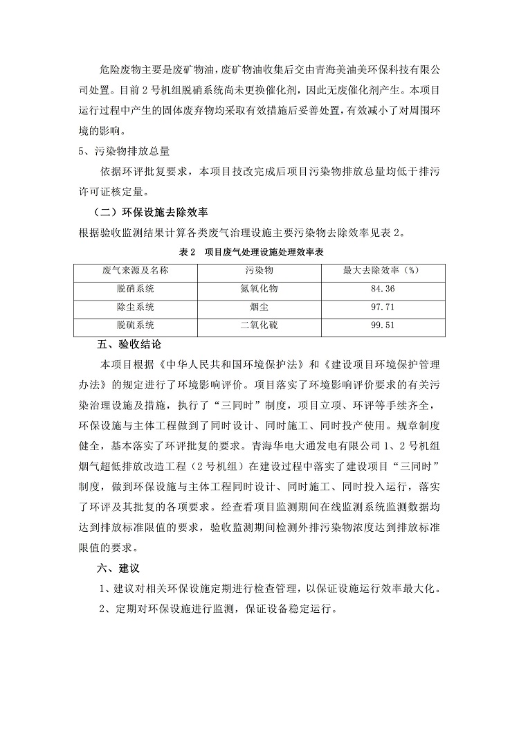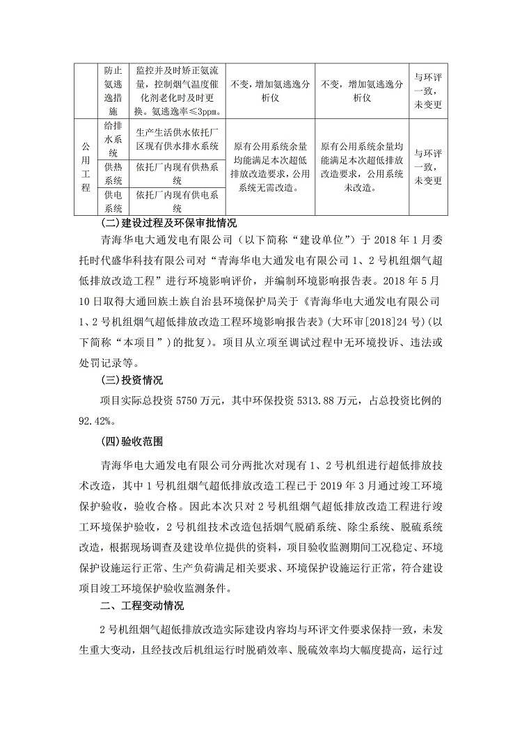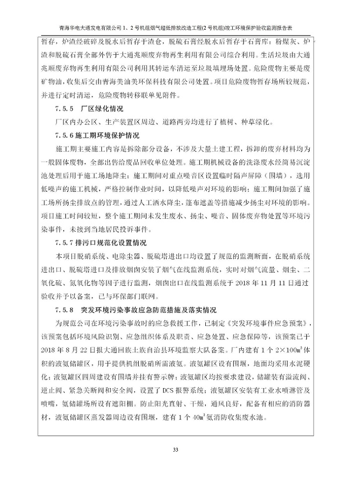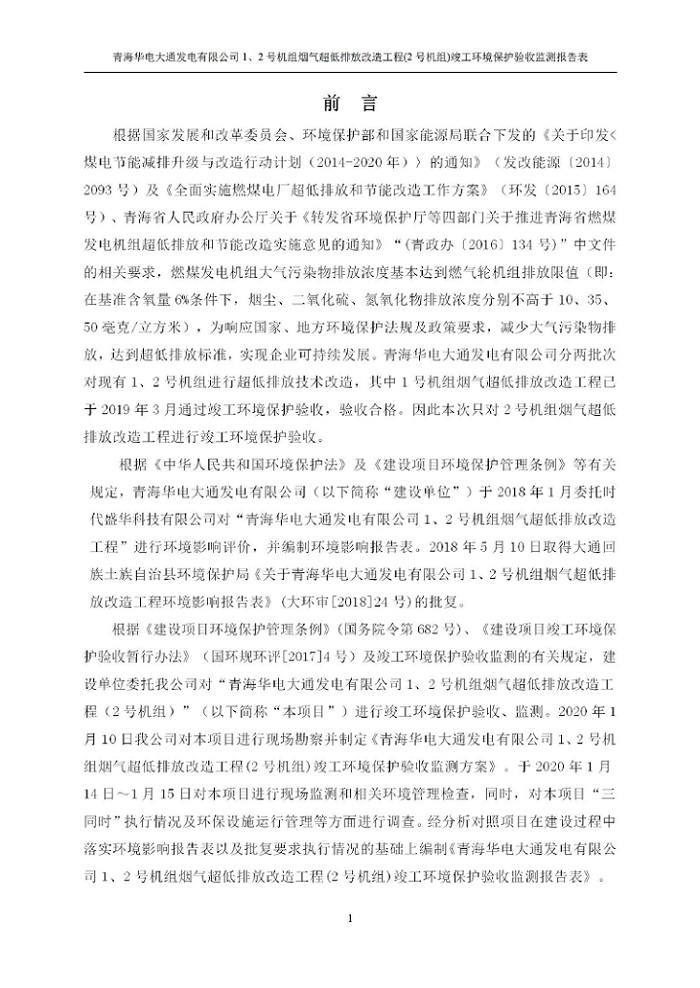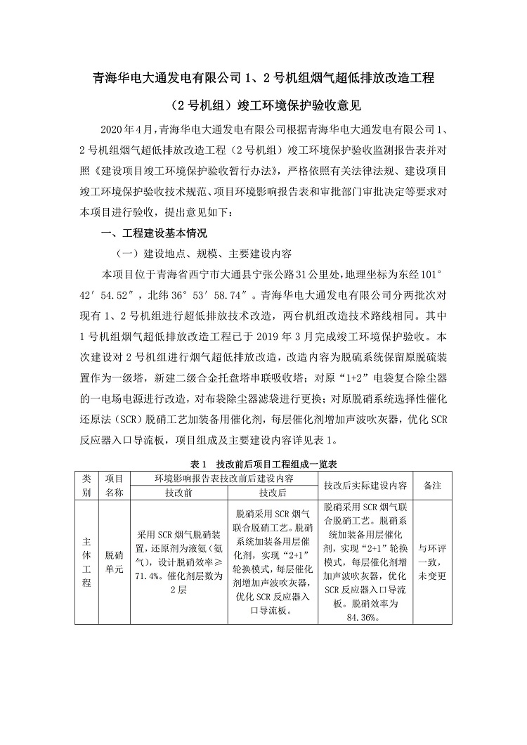 根據(jù)中華人民共和國國務(wù)院令第682號(hào)《國務(wù)院關(guān)于修改〈建設(shè)項(xiàng)目環(huán)境保護(hù)管理?xiàng)l例〉的決定》和《建設(shè)項(xiàng)目竣工環(huán)境保護(hù)驗(yàn)收暫行辦法》(國務(wù)院令682號(hào)),青海華電大通發(fā)電有限公司1、2號(hào)機(jī)組煙氣超低排放改造工程(2號(hào)機(jī)組) (包括竣工環(huán)境保護(hù)驗(yàn)收監(jiān)測(cè)報(bào)告表和驗(yàn)收意見)公示如下。 一、項(xiàng)目名稱:青海華電大通發(fā)電有限公司1、2號(hào)機(jī)組煙氣超低排放改造工程(2號(hào)機(jī)組) 竣工環(huán)境保護(hù)驗(yàn)收監(jiān)測(cè)報(bào)告表 二、地點(diǎn):青海省西寧市大通縣寧張公路31公里處 三、建設(shè)單位:青海華電大通發(fā)電有限公司 四、建設(shè)內(nèi)容:2號(hào)機(jī)組煙氣超低排放改造,2號(hào)機(jī)組改造內(nèi)容為脫硫系統(tǒng)保留原脫硫裝置作為一級(jí)塔,新建二級(jí)合金托盤塔串聯(lián)吸收塔;對(duì)原“1+2”電袋復(fù)合除塵器的一電場電源進(jìn)行改造,對(duì)布袋除塵器濾袋進(jìn)行更換;對(duì)原脫硝系統(tǒng)選擇性催化還原法(SCR)脫硝工藝加裝備用催化劑,每層催化劑增加聲波吹灰器,優(yōu)化SCR反應(yīng)器入口導(dǎo)流板。 五、聯(lián)系人:馬世敏 六、聯(lián)系電 話:0971-6515411 七、公示時(shí)間:二〇二〇年四月二十九日至二〇二〇年五月二十八日 公示期間,對(duì)上述公示內(nèi)容如有異議,請(qǐng)以書面形式反饋,個(gè)人須署真實(shí)姓名,單位須加蓋公章。