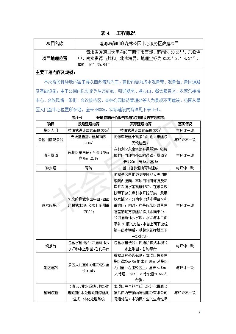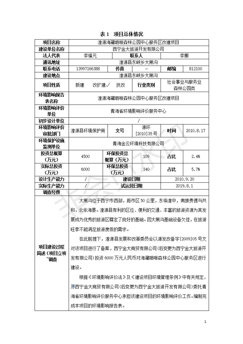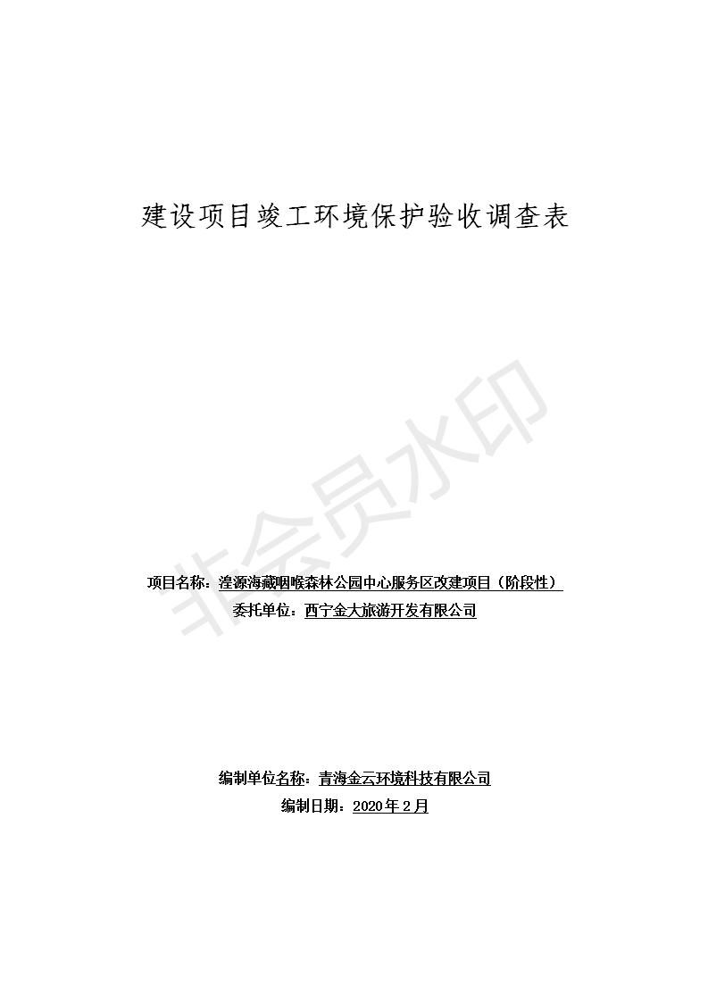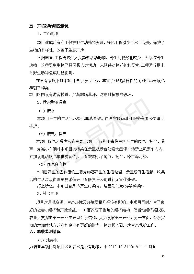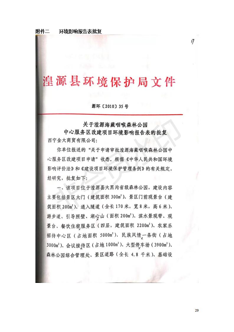 根據(jù)中華人民共和國國務院令第682號《國務院關于修改〈建設項目環(huán)境保護管理條例〉的決定》和《建設項目竣工環(huán)境保護驗收暫行辦法》(國務院令682號),湟源海藏咽喉森林公園中心服務區(qū)改建項目(階段性),(包括竣工環(huán)境保護驗收調(diào)查表和驗收意見)公示如下。 一、項目名稱:湟源海藏咽喉森林公園中心服務區(qū)改建項目(階段性) 竣工環(huán)境保護驗收調(diào)查表 二、地點:青海省湟源縣東峽鄉(xiāng)大黑溝 三、建設單位:西寧金大旅游開發(fā)有限公司 四、建設內(nèi)容:本次階段性驗收以自然景觀為主,建設內(nèi)容為濱水景觀帶、觀景臺、景區(qū)道路及基礎設施。項目范圍從景區(qū)大門至中心位置,全長4800m。 五、聯(lián)系人:張工 六、聯(lián)系電 話:0971-6515411 七、公示時間:二〇二〇年四月二十九日至二〇二〇年五月二十八日 公示期間,對上述公示內(nèi)容如有異議,請以書面形式反饋,個人須署真實姓名,單位須加蓋公章。