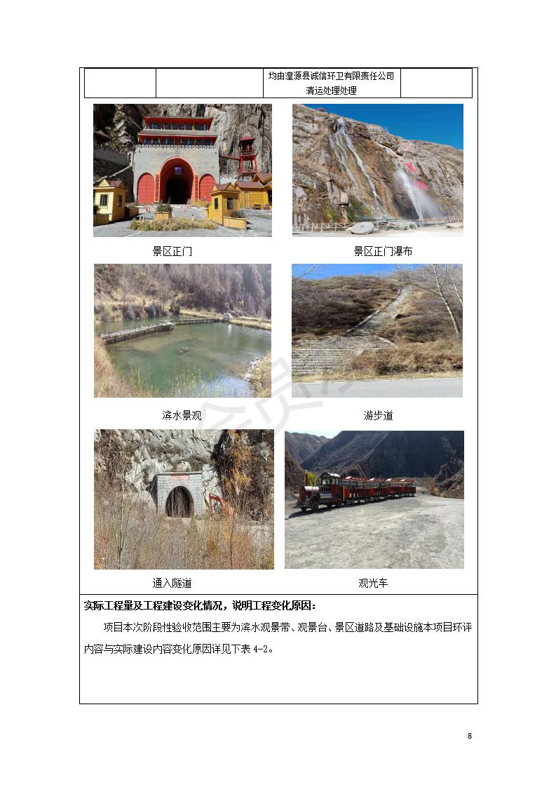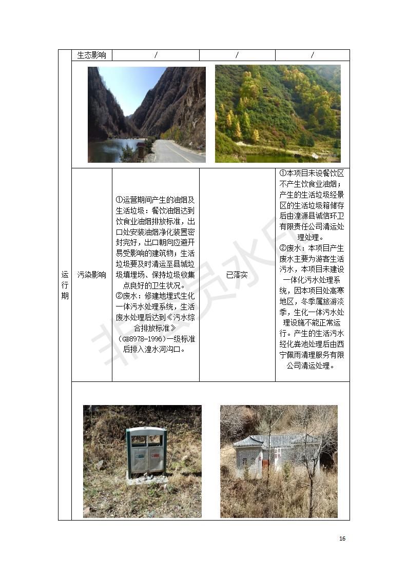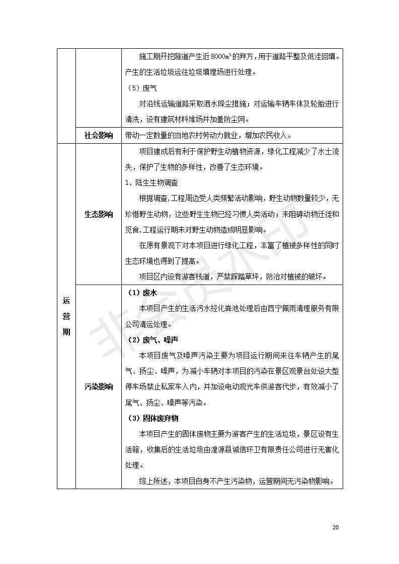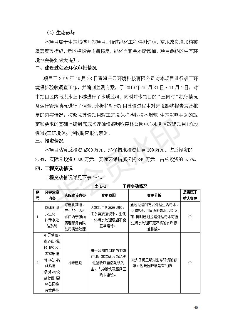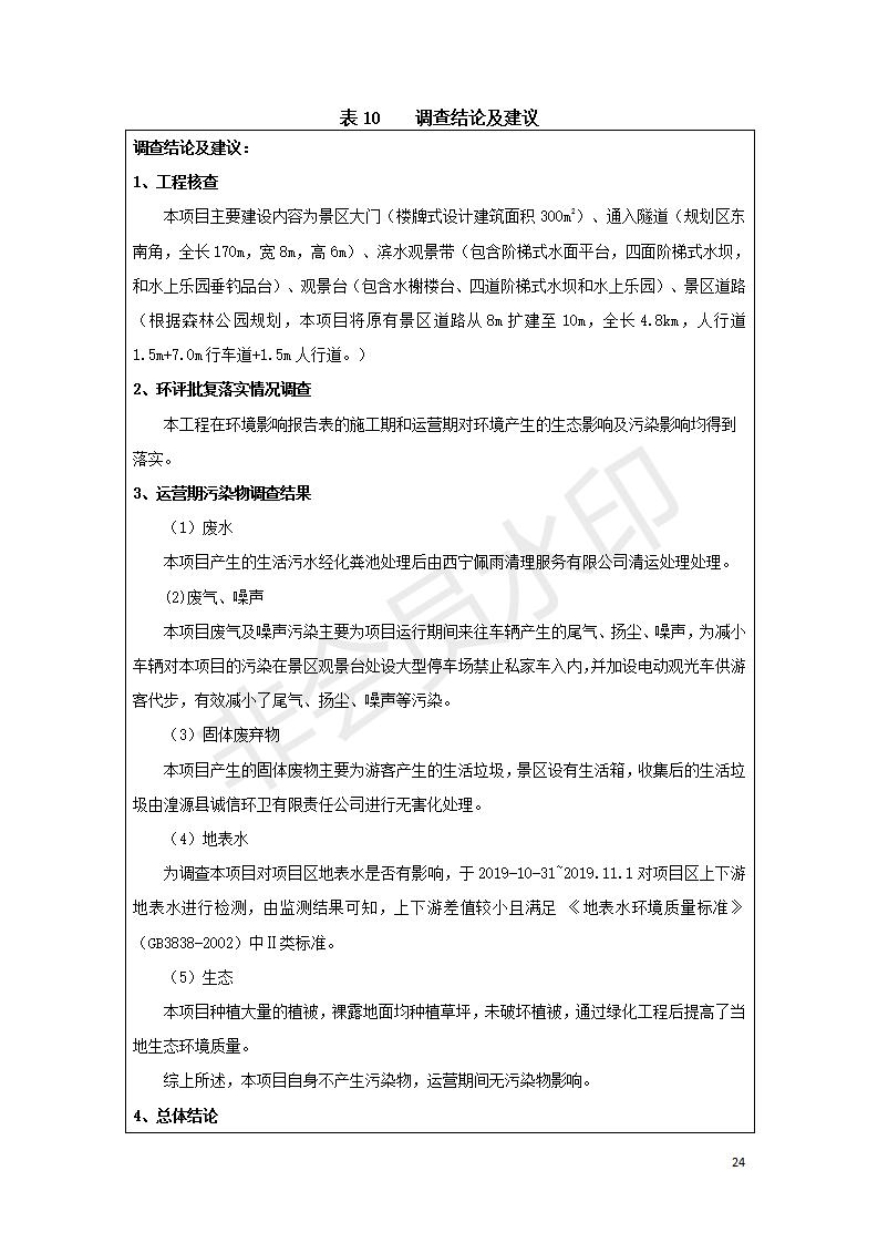 根據(jù)中華人民共和國國務院令第682號《國務院關于修改〈建設項目環(huán)境保護管理條例〉的決定》和《建設項目竣工環(huán)境保護驗收暫行辦法》(國務院令682號),湟源海藏咽喉森林公園中心服務區(qū)改建項目(階段性),(包括竣工環(huán)境保護驗收調(diào)查表和驗收意見)公示如下。 一、項目名稱:湟源海藏咽喉森林公園中心服務區(qū)改建項目(階段性) 竣工環(huán)境保護驗收調(diào)查表 二、地點:青海省湟源縣東峽鄉(xiāng)大黑溝 三、建設單位:西寧金大旅游開發(fā)有限公司 四、建設內(nèi)容:本次階段性驗收以自然景觀為主,建設內(nèi)容為濱水景觀帶、觀景臺、景區(qū)道路及基礎設施。項目范圍從景區(qū)大門至中心位置,全長4800m。 五、聯(lián)系人:張工 六、聯(lián)系電 話:0971-6515411 七、公示時間:二〇二〇年四月二十九日至二〇二〇年五月二十八日 公示期間,對上述公示內(nèi)容如有異議,請以書面形式反饋,個人須署真實姓名,單位須加蓋公章。